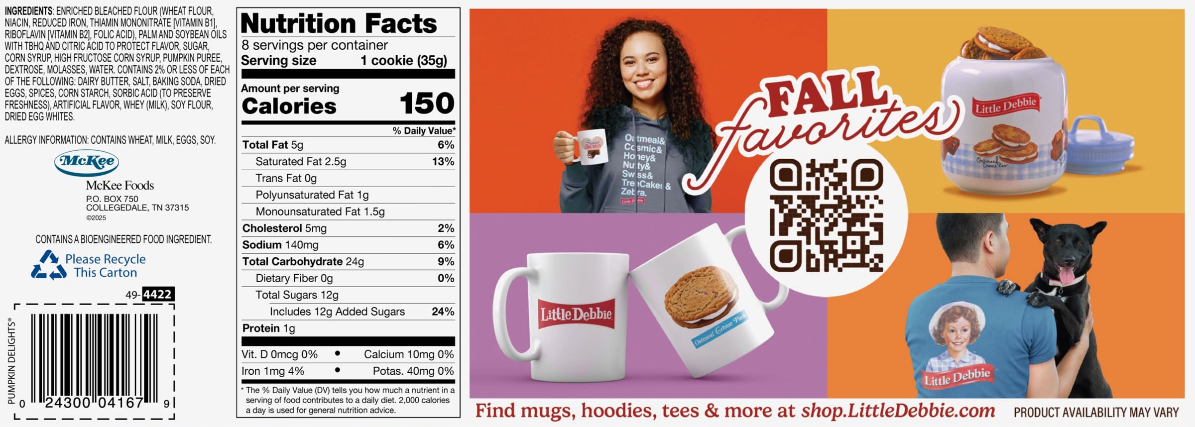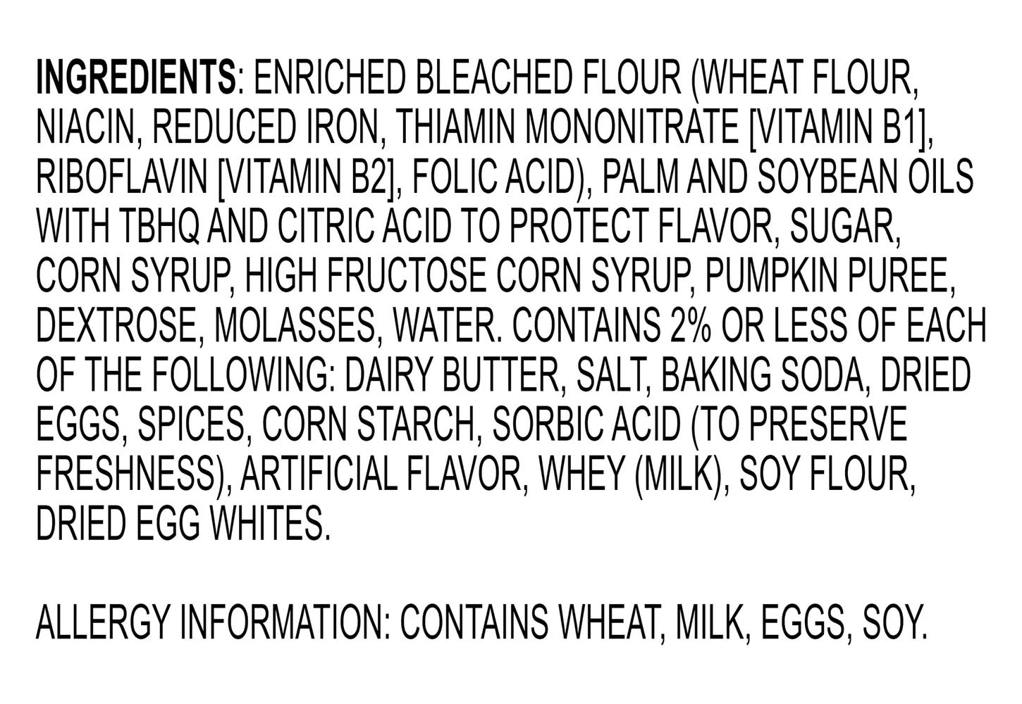 Ingredients: Enriched Bleached Flour (wheat Flour, Niacin, Reduced Iron, Thiamin Mononitrate [vitamin B1], Riboflavin [vitamin B2], Folic Acid), Palm And Soybean Oils With Tbhq And Citric Acid To Protect Flavor, Sugar,, Corn Syrup, Pumpkin Puree, High Fructose Corn Syrup, Dextrose, Molasses, Water. Contains 2% Or Less Of Each Of The Following: Soy Flour, Dairy Butter,, Salt, Baking Soda, Eggs, Spices, Corn Starch, Sorbic Acid (to Preserve Freshness), Artificial Flavors, Whey (milk), Egg Whites. Contains: Wheat, Milk, Eggs, Soybeans, Corn