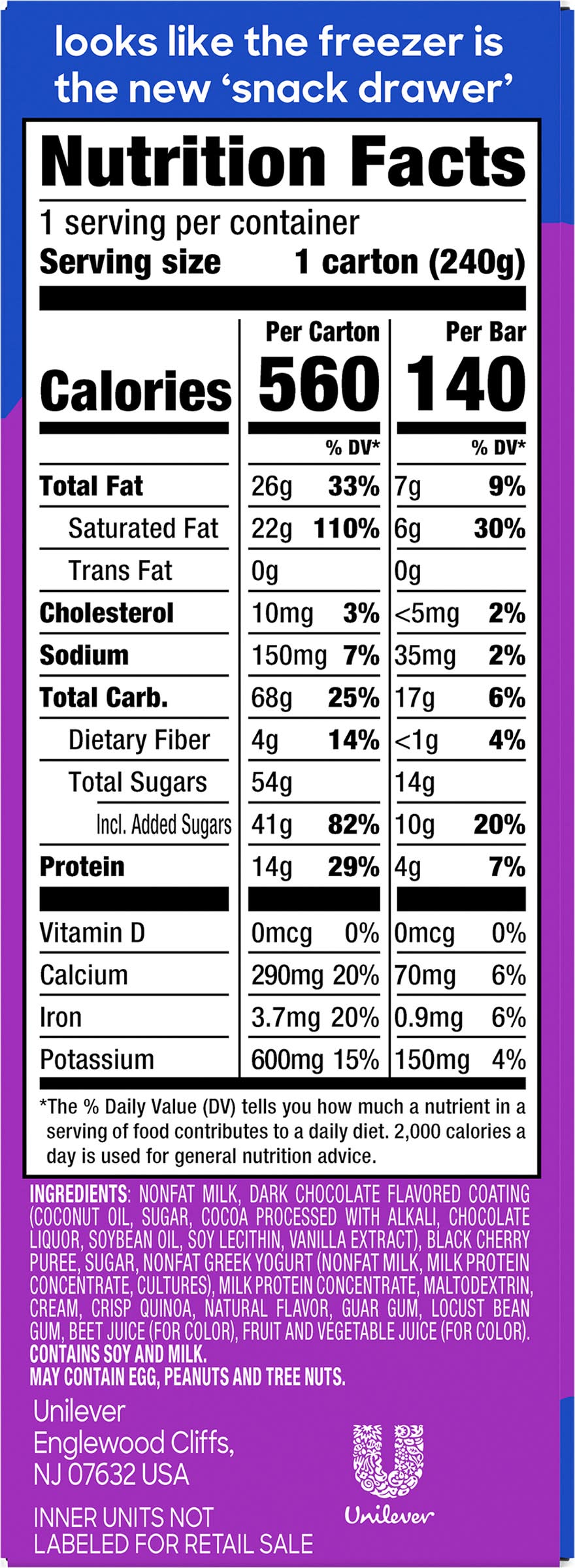 Ingredients: Nonfat Milk, Dark Chocolate Flavored Coating (Coconut Oil, Sugar, Cocoa Processed with Alkali, Chocolate Liquor, Soybean Oil, Soy Lecithin, Vanilla Extract), Black Cherry Puree, Sugar, Nonfat Greek Yogurt (Nonfat Milk, Milk Protein Concentrate, Cultures), Milk Protein Concentrate, Maltodextrin, Cream, Crisp Quinoa, Natural Flavor, Guar Gum, Locust Bean Gum, Beet Juice (for Color), Fruit and Vegetable Juice (for Color) Contains: Soybeans, Milk, Eggs, Peanuts, Tree Nuts