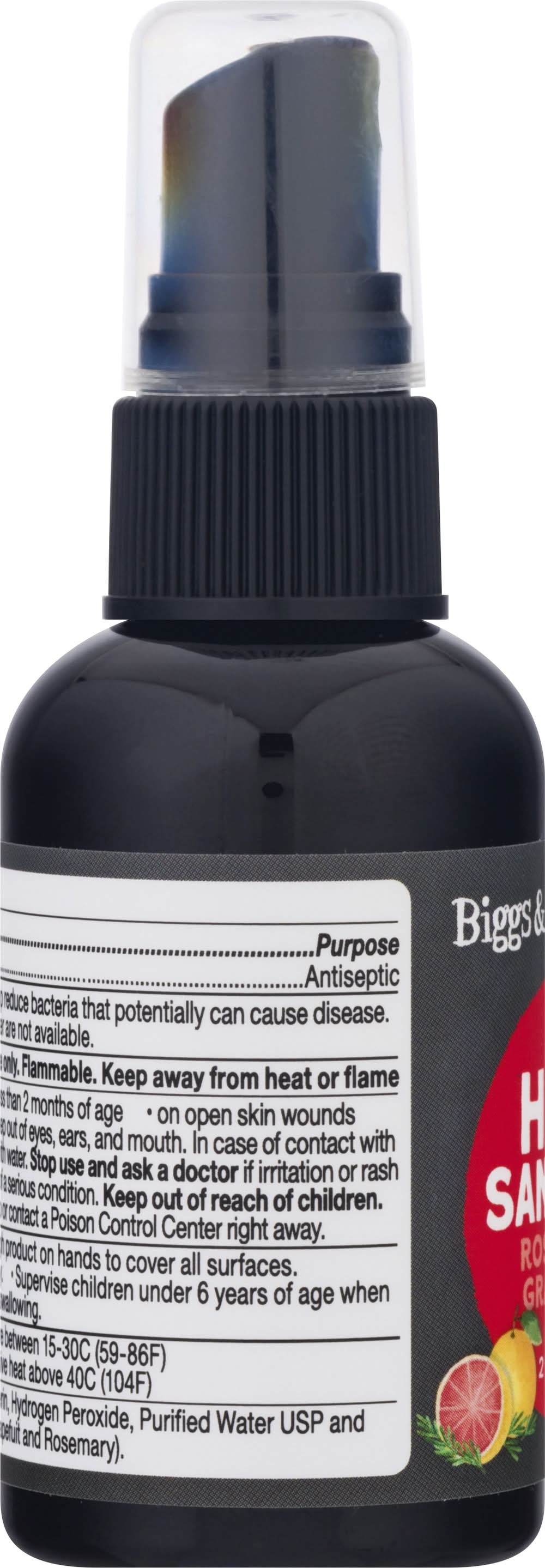 Active Ingredients: Alcohol (78 %), Antiseptic. Inactive Ingredients: Glycerin, Hydrogen Peroxide, Purified Water USP and Essential Oil Blend (Pink Grapefruit and Rosemary) . Additives: Glycerin Hydrogen Peroxide, Purified Water USP and Essential Oil Blend