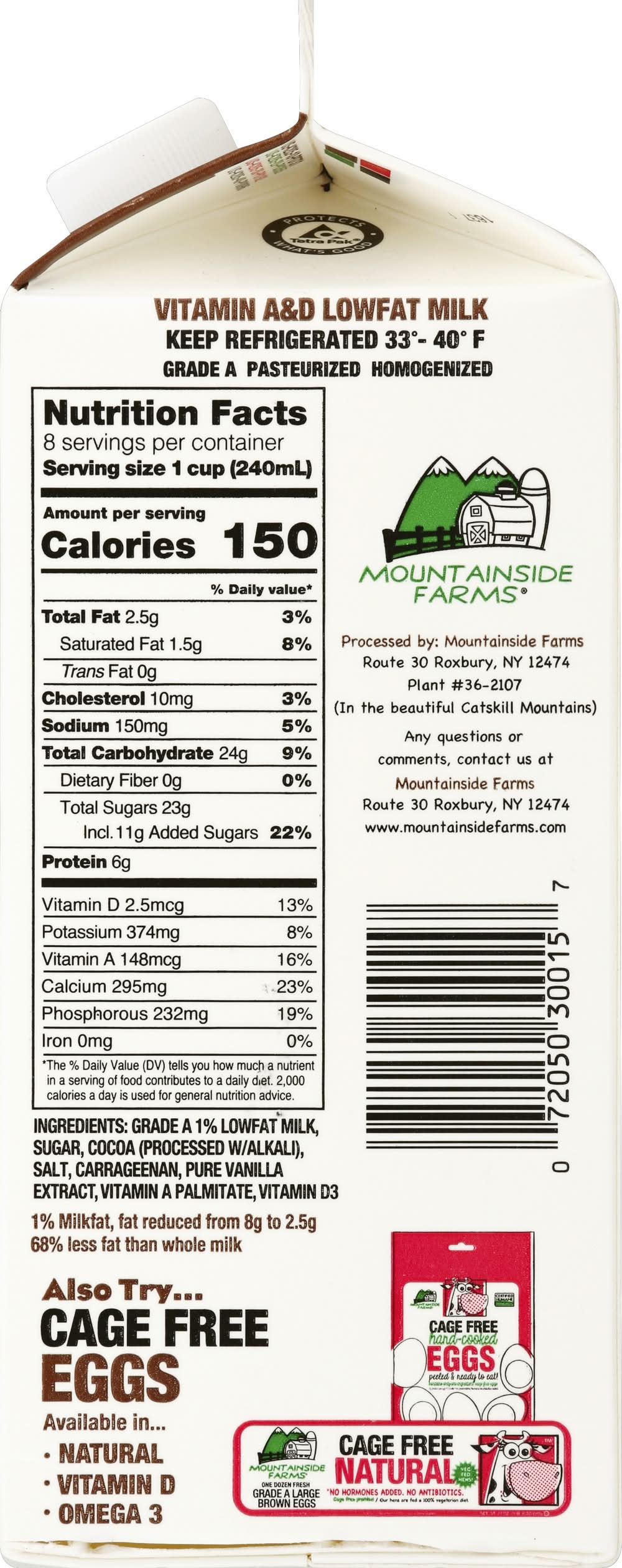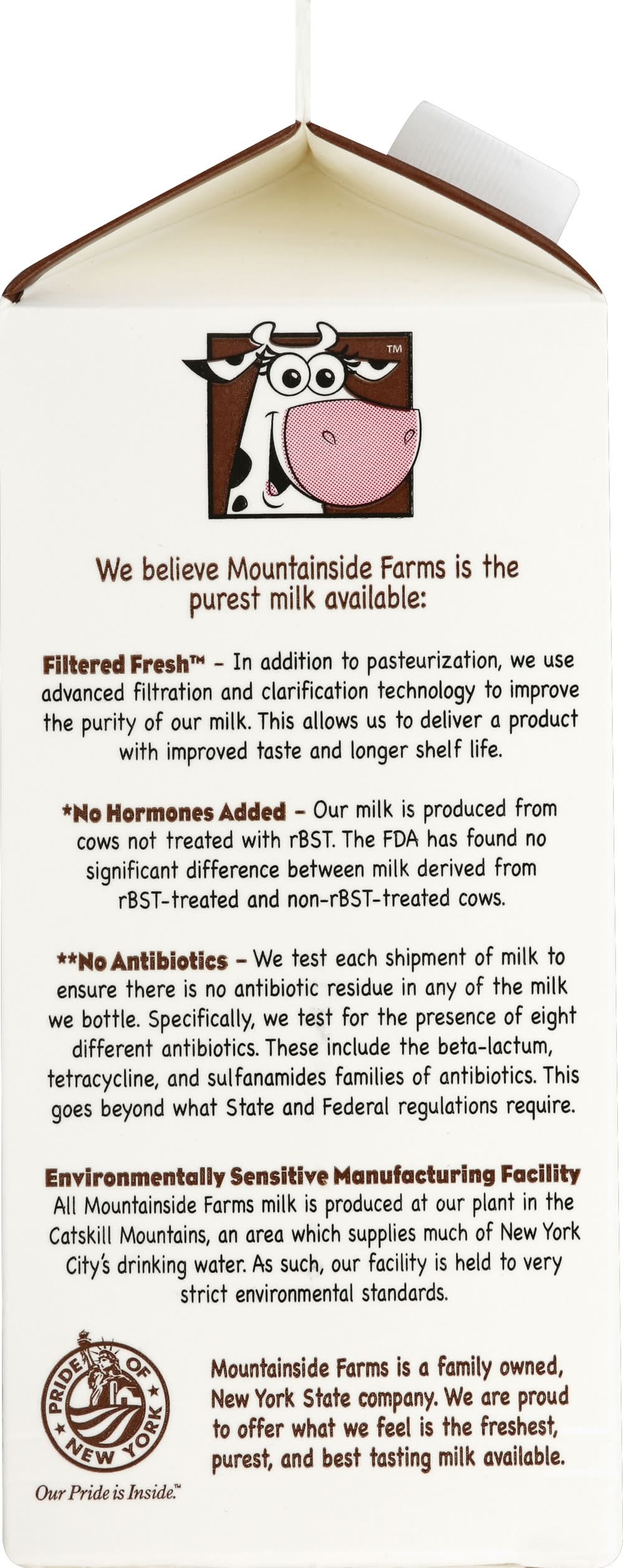 Pasteurized. Homogenized. Vitamin A & D. 68% less fat than whole milk. No hormones added (No Hormones Added - Our milk is produced from cows not treated with rBST. The FDA has found no significant difference between milk derived from rBST-treated and non-rBST-treated cows). No antibiotics (No Antibiotics - We test each shipment of milk to ensure there is no antibiotic residue in any of the milk we bottle. Specifically, we test for the presence of eight different antibiotics. These include the beta-lactam, tetracycline, and sulfonamides families of antibiotics. This goes beyond what State and Federal regulations require). Filtered Fresh Process: advanced filtration; fresh pasteurization. The Result: Milk that stays fresh longer, with a better, cleaner taste. Bad stuff removed. Filtered Fresh: In addition to pasteurization, we purify our milk even further with advanced filtration and clarification technology. These clarifiers remove bacteria, and that makes our milk stay fresh longer, with a better, cleaner taste. We believe Mountainside Farms is the purest milk available: Filtered Fresh - In addition to pasteurization, we use advanced filtration and clarification technology in addition to pasteurization to improve the purity of our milk. This allows us to deliver a product with improved taste and shelf life. No Hormones Added - Our milk is produced from cows not treated with rBST. The FDA has found no significant difference between milk derived from rBST-treated and non-rBST-treated cows. No Antibiotics - We test each shipment of milk to ensure there is no antibiotic residue in any of the milk we bottle. Specifically, we test for the presence of eight different antibiotics. These include the beta-lactam, tetracycline, and sulfonamides families of antibiotics. This goes beyond what State and Federal regulations require. Environmentally Sensitive Manufacturing Facility - All Mountainside Farms milk is produced at our plant in the Catskill mountains, an area which supplies much of New York City's drinking water. As such, our facility is held to very strict environmental standards. Pride of New York. Our pride is inside. Mountainside Farms is a family owned, New York State company. Tetra Pak: Protect what's good. Grade A. Pasteurized. Homogenized. Any questions or comments, contact us at Mountainside Farms Route 30 Roxbury, NY 12474, www.mountainsidefarms.com. We are proud to offer what we feel is the freshest, purest, and best tasting milk available. Pride of New York. Our pride is inside. www.mountainsidefarms.com. 1% milkfat, fat reduced from 8 g to 2.5 g. 68% less fat than whole milk. MOUNTAINSIDE FARMS,