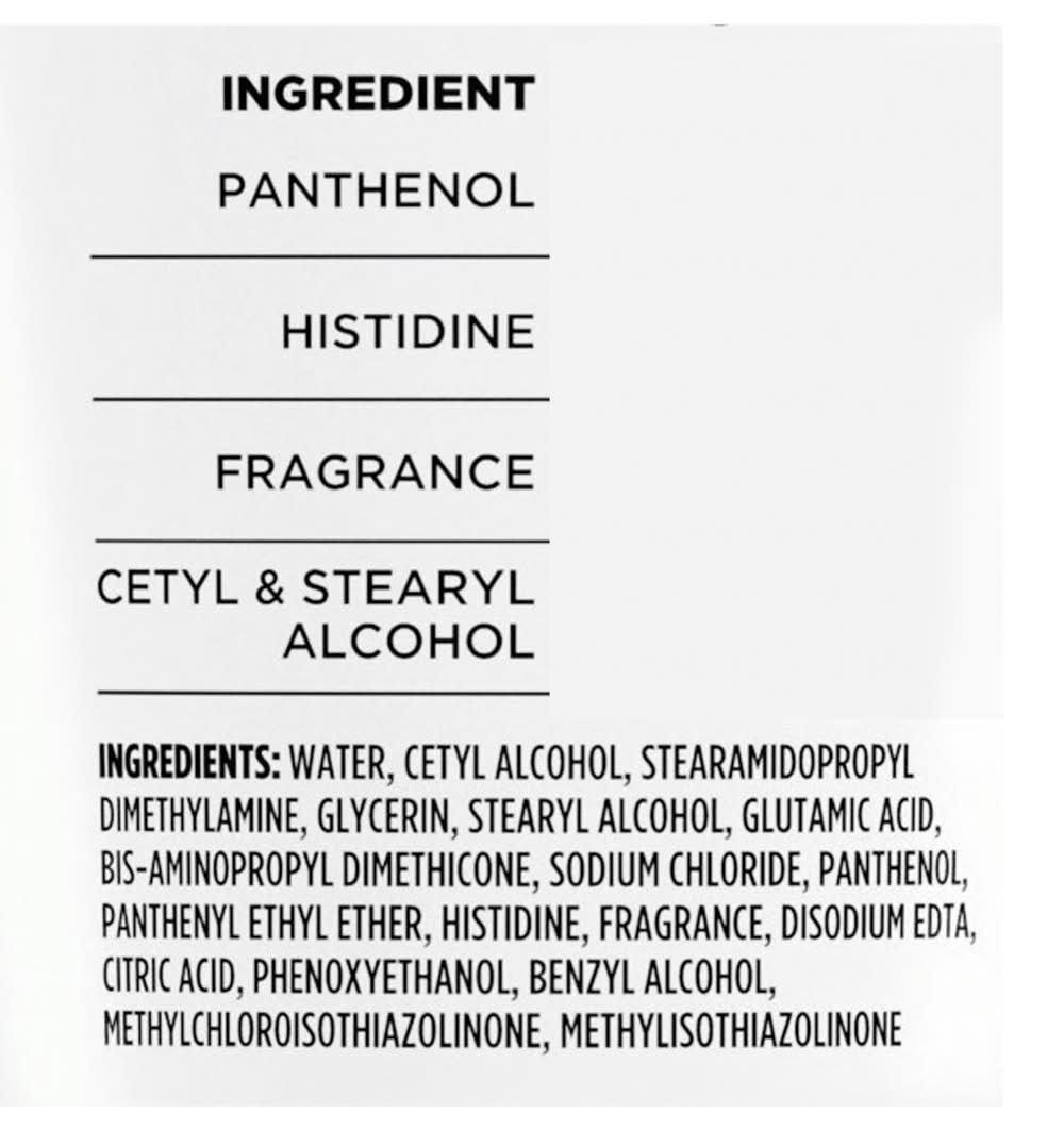 Ingredients: Water, Cetyl Alcohol, Stearamidopropyl Dimethylamine, Glycerin, Stearyl Alcohol, Glutamic Acid, Bis-Aminopropyl Dimethicone, Sodium Chloride, Panthenol, Panthenyl Ethyl Ether, Histidine, Fragrance, Disodium EDTA, Citric Acid, Phenoxyethanol, Benzyl Alcohol, Methylchloroisothiazolinone, Methylisothiazolinone