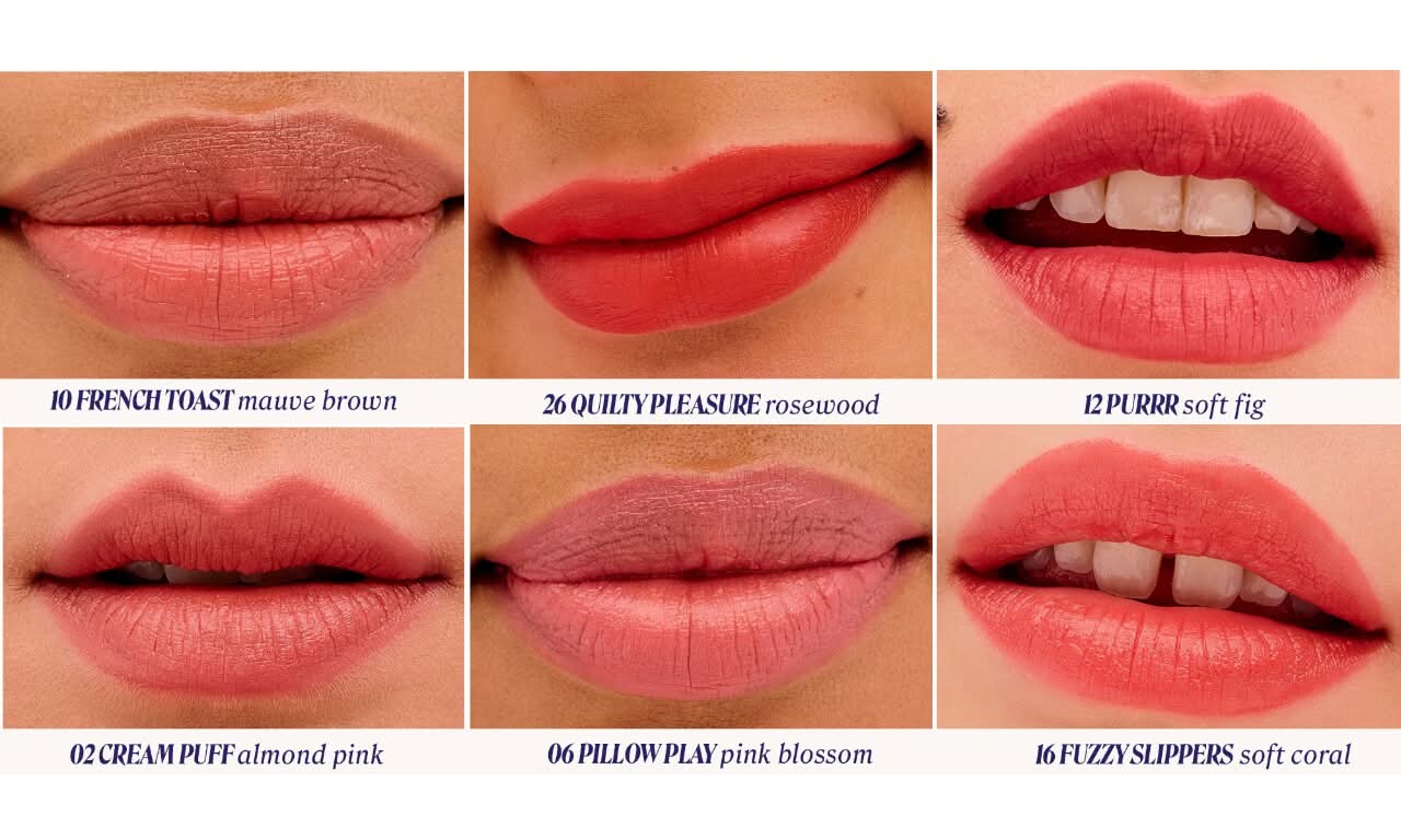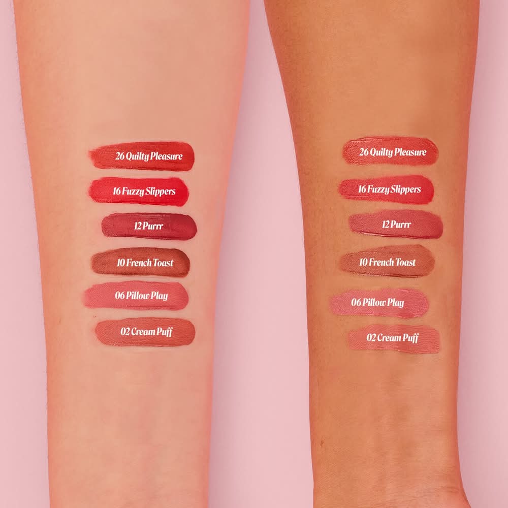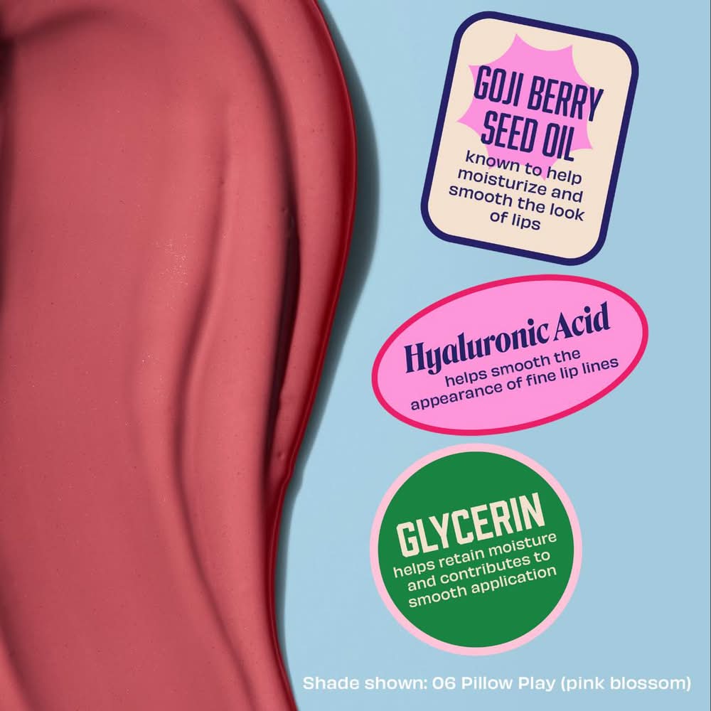 What it is: A matte, longwearing lip tint that gives lips smudge-proof color and moisture for a moisturizing, comfortable feel and soft-blur velvety finish. Formulation Type: Lip Stain Benefits: Hydrating and Long-wearing What Else You Need to Know: A plush-matte lip tint with 8-hour* moisture and 8-hour* longwear that's smudge-proof and won't feather or bleed. The soft-focus blurring effect makes lips look smooth and velvety. Plus, the custom carved applicator easily outlines lips. *instrumental tests on 30 participants. Clinical Results: In a self-evaluation study of 104 participants after 1 week:- 97% said it feels comfortable on lips all day** - 100% agree it feels cushiony**- 98% said lips look velvety** Color: 06 pillow play