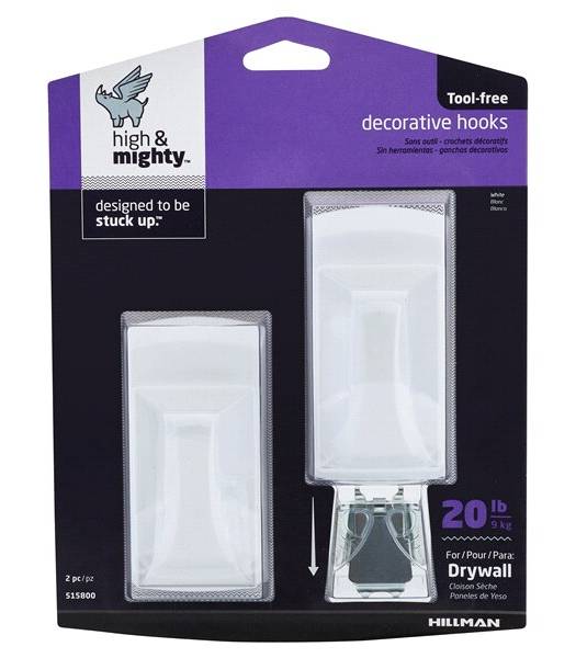 High & Mighty Decorative Hooks are white plastic hooks crafted for straightforward installation directly into drywall. These hooks are unique in that they do not require any tools to install; they can be placed, pushed, and hung using only thumbs. For removal or replacement, a flathead screwdriver or a similar tool is sufficient. The design focuses on both functionality and aesthetic appeal, making them a practical choice for hanging decorations or other items.