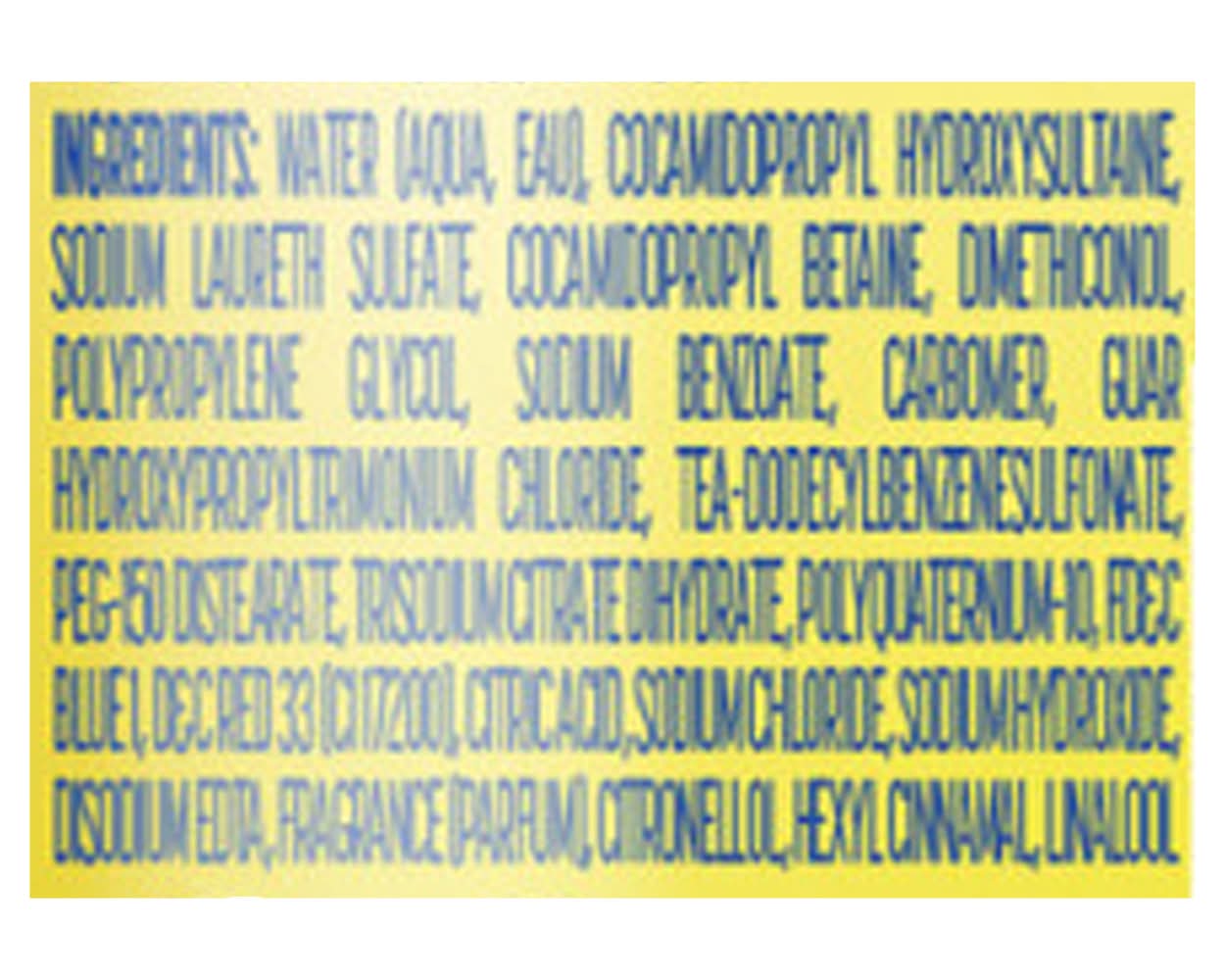 Ingredients: Water (Aqua, Eau), Cocamidopropyl Hydroxysultane, Sodium Laureth Sulfate, Cocamidopropyl Betaine, Dimethiconol, Polypropylene Glycol, Sodium Benzoate, Carbomer, Guar Hydroxypropyltrimonium Chloride, TEA-Dodecylbenzenesulfonate, PEG-150 Distearate, Trisodium Citrate Dihydrate, Polyquaternuim-10, FD&C Blue 1, D&C Red 33 (CI 17200), Citric Acid, Sodium Chloride, Sodium Hydroxide, Disodium EDTA, Fragrance (Parfum), Citronellol, Hexyl Cinnamal, Linalool