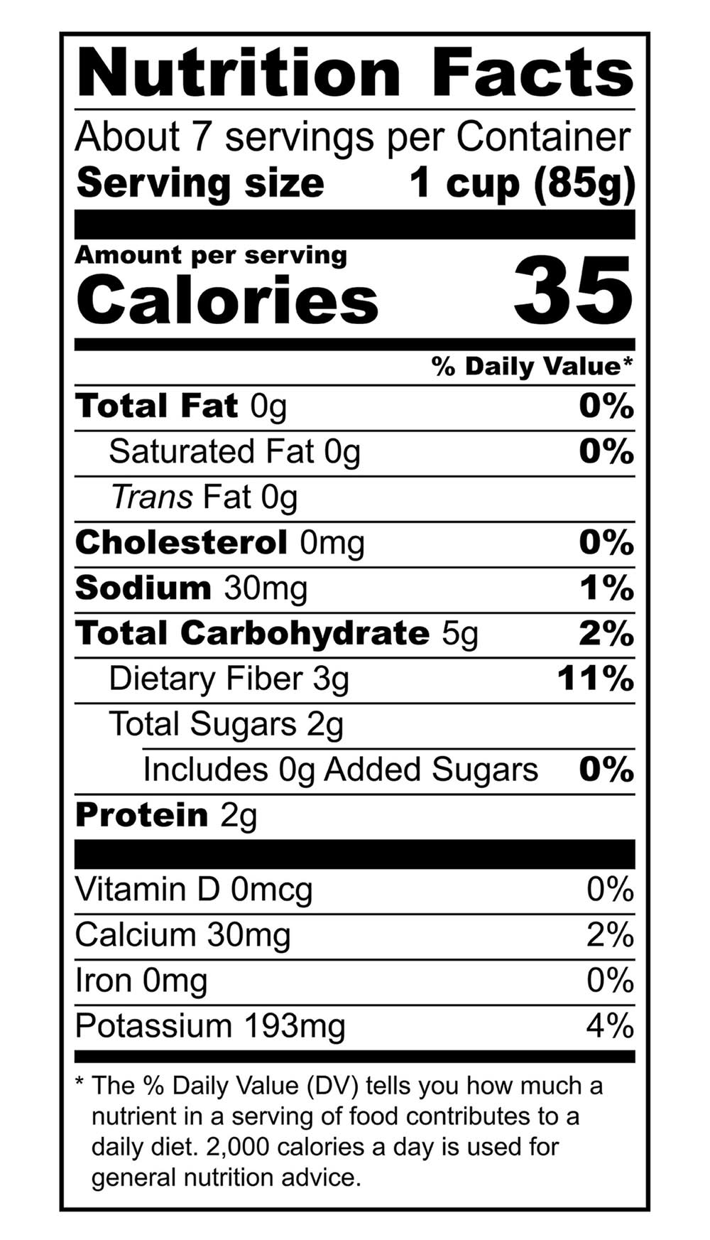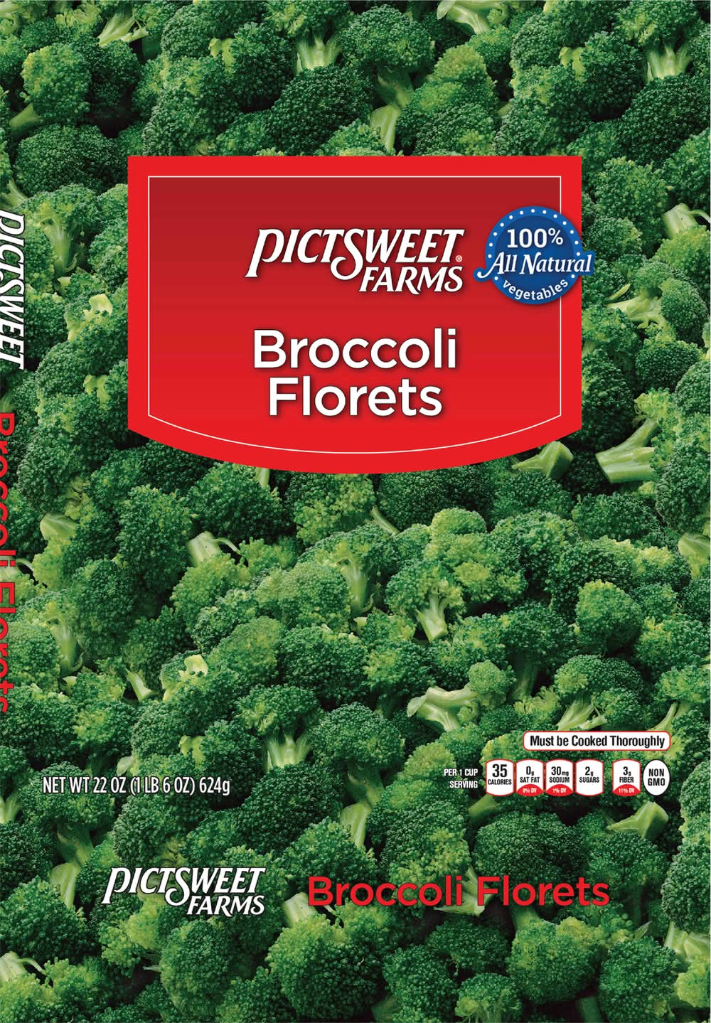 This offer a nutritious addition to any meal. Each one-cup serving contains 35 calories, with zero grams of saturated fat, 30 milligrams of sodium, two grams of sugars, and three grams of dietary fiber. These broccoli florets are non-GMO.