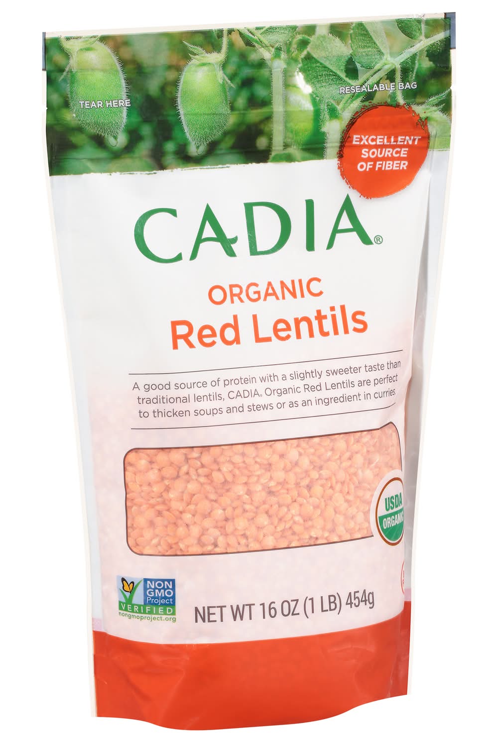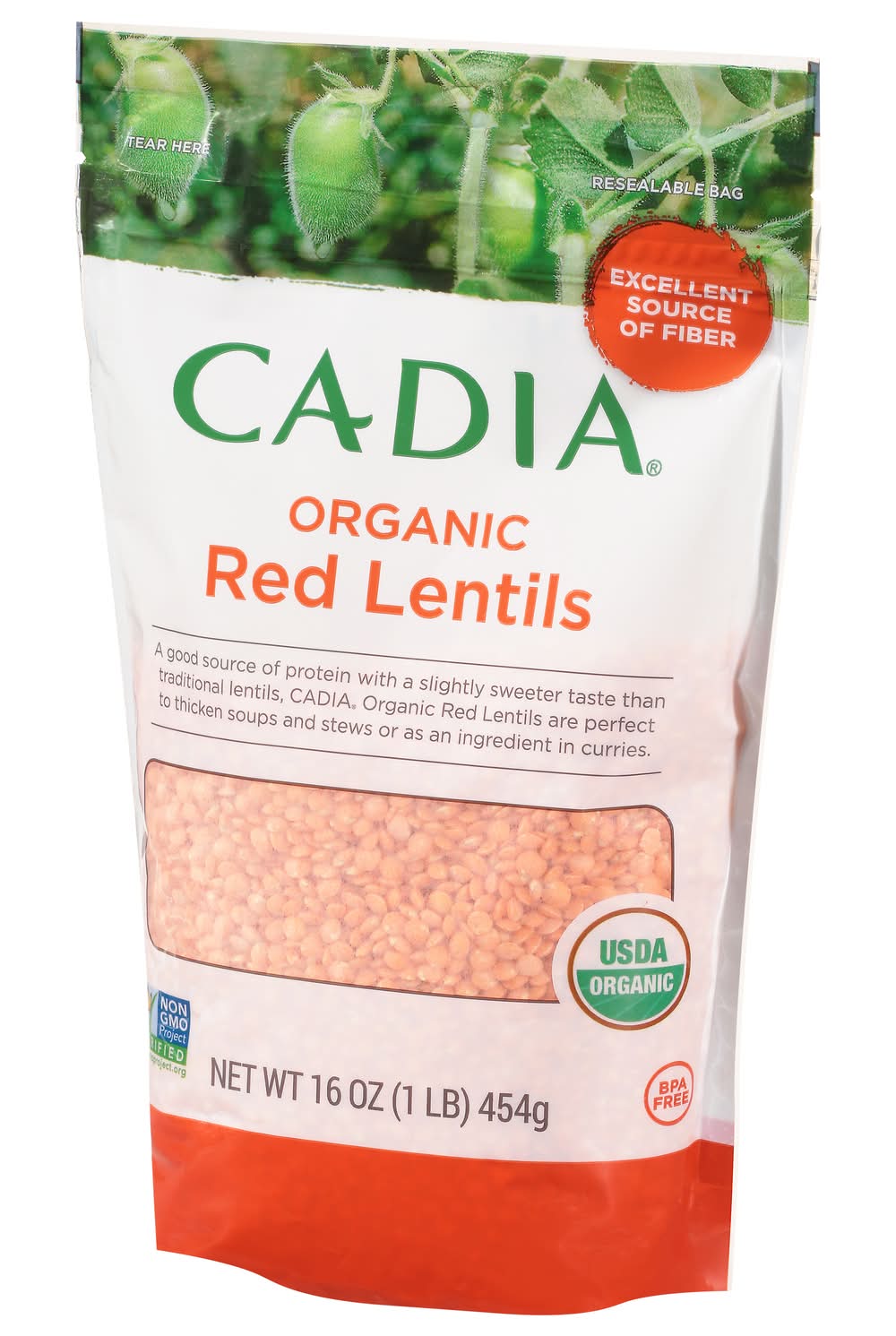 Organic. USDA Organic. Vegan. Certified Organic by Quality Assurance International. Excellent source of fiber. No added salt. Non-GMO Project verified. nongmoproject.org. A good source of protein with a slightly sweeter taste than traditional lentils, Cadia Organic Red Lentils are perfect to thicken soups and stews or as an ingredient in curries. Organic red lentils are an excellent source of fiber and a good source of protein. Red lentils do not require soaking and soften easily. Because they soften so nicely, they are great for soups and stews and ready in just 6-12 minutes. What makes red lentils stand out from their other lentil cousins? They break down while cooking, creating a creamy texture and slightly sweet, nutty flavor. The perfect recipe base for curries, soups, stews, dips, and Indian dal. No preservatives. Lentils are a natural agricultural product. Despite the use of modern cleaning equipment, it is not always possible to remove all foreign materials. Sort, remove foreign material and rinse lentils before cooking. Created for neighborhood natural markets. MyCadia.com. Facebook. Certified B Corporation. Cadia, is a brand of KeHE, a Certified B Corp. Resealable bag. BPA free.