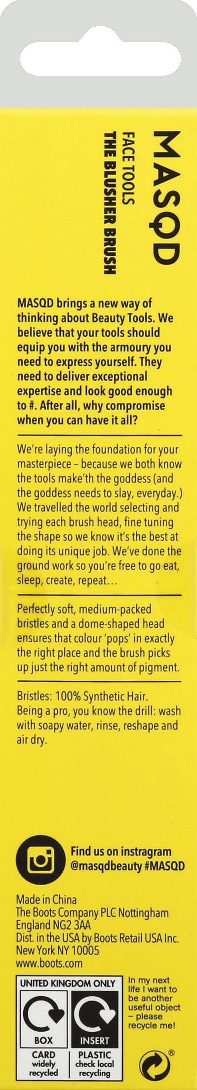 MASQD brings a new way of thinking about Beauty Tools. We believe that your tools should equip you with the armoury you need to express yourself. They need to deliver exceptional expertise and look good enough to hashtag. After all, why compromise when you can have it all? We're laying the foundation for your masterpiece - because we both know the tools make'th the goddess (and the goddess needs to slay, everyday). We travelled the world selecting and trying each brush head, fine tuning the shape so we know it's the best at doing its unique job. We've done the ground work so you're free to go eat, sleep, create, repeat. Perfectly soft, medium-packed bristles and a dome-shaped head ensures that colour pops in exactly the right place and the brush picks up just the right amount of pigment. Bristle: 100% synthetic hair. Instagram: Find us on Instagram (at)masqdbeauty (hashtag)MASQD. www.boots.com. In my next life I want to be another useful object - please recycle me! Made in China. • Boots Retail USA, • Packaging: Reusable