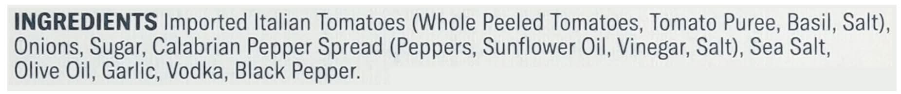 Ingredients: Imported Italian Tomatoes (Whole Peeled Tomatoes, Tomato Puree, Basil, Salt), Onions, Sugar, Calabrian Pepper Spread (Peppers, Sunflower Oil, Vinegar, Salt), Sea Salt, Olive Oil, Garlic, Vodka, Black Pepper