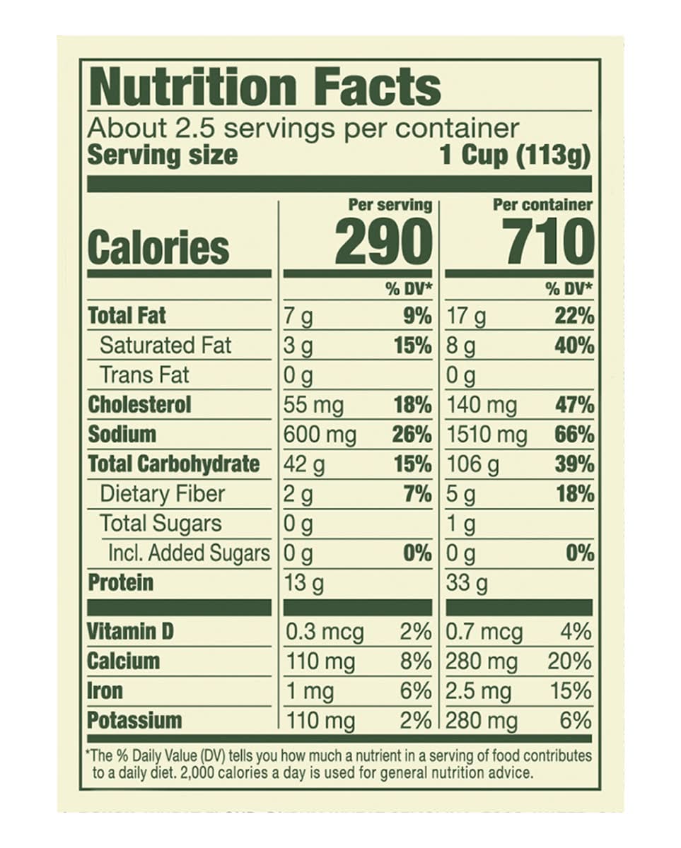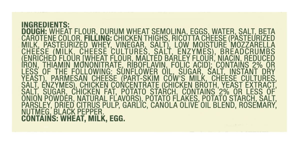 Dough: Wheat Flour, Durum Wheat Semolina, Eggs, Water, Salt, Beta Carotene Color, Filling: Chicken Thighs, Ricotta Cheese (Pasteurized Milk, Pasteurized Whey, Vinegar, Salt), Low Moisture Mozzarella Cheese (Milk, Cheese Cultures, Salt, Enzymes), Breadcrumbs (Enriched Flour [Wheat Flour, Malted Barley Flour, Niacin, Reduced Iron, Thiamin Mononitrate, Riboflavin, Folic Acid]; Contains 2% or Less of the Following: Sunflower Oil, Sugar, Salt, Instant Dry Yeast), Parmesan Cheese (Part-Skim Cow's Milk, Cheese Cultures, Salt, Enzymes), Chicken Concentrate (Chicken Broth, Yeast Extract, Salt, Sugar, Chicken Fat, Potato Starch, Contains 2% or Less of Onion Powder, Natural Flavors), Potato Flakes, Potato Starch, Salt, Parsley, Dried Citrus Pulp, Garlic, Canola Olive Oil Blend, Rosemary, Nutmeg, Black Pepper Contains: Wheat, Eggs, Milk, Barley