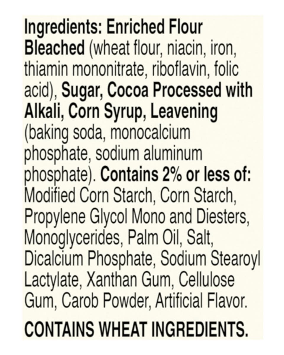 Ingredients: Enriched Flour Bleached (Wheat Flour, Niacin, Iron, Thiamin Mononitrate, Riboflavin, Folic Acid), Sugar, Cocoa Processed with Alkali, Corn Syrup, Leavening (Baking Soda, Monocalcium Phosphate, Sodium Aluminum Phosphate), Contains 2% or Less of: Modified Corn Starch, Corn Starch, Propylene Glycol Mono and Diesters, Monoglycerides, Palm Oil, Salt, Dicalcium Phosphate, Sodium Stearoyl Lactylate, Xanthan Gum, Cellulose Gum, Carob Powder, Artificial Flavor Contains: Wheat, Corn