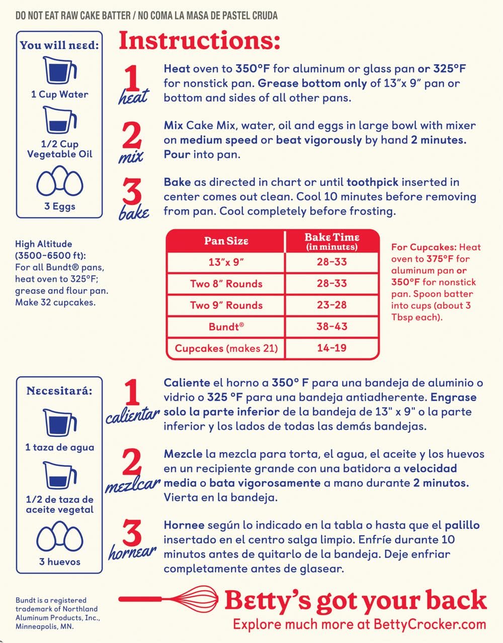 Directions: you will need: 1 cup water; 1/2 cup vegetable oil; 3 eggs. instructions: 1. heat oven to 350 degrees f for aluminum or glass pan or 325 degrees f for nonstick pan. grease bottom only of 13 inches x 9 inches pan or bottom and sides of all other pans. 2. mix cake mix, water, oil and eggs in large bowl with mixer on medium speed or beat vigorously by hand 2 minutes. pour into pan. 3. bake as directed in chart or until toothpick inserted in center comes out clean. cool 10 minutes before removing from pan. cool completely before frosting. pan size: 13 inches x 9 inches; 28-33 bake time (in minutes); pan size: two 8 inches rounds; 28-33 bake time (in minutes); pan size: two 9 inches rounds; 23-28 bake time (in minutes); pan size: bundt; 38-43 bake time (in minutes); pan size: cupcakes (makes 21); 14-19 bake time (in minutes). for cupcakes: heat oven to 375 degrees f for aluminum pan or 350 degrees f for nonstick pan. spoon batter into cups (about 3 tbsp each). high altitude (3500-6500 ft): for all bundt pans, heat oven to 325 degrees f; grease and flour pan. make 32 cupcakes. do not eat raw cake batter.