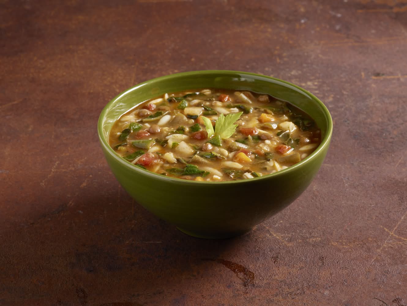 FILTERED WATER, ORGANIC DICED TOMATOES, ORGANIC ONIONS, ORGANIC ZUCCHINI, ORGANIC LEEKS, ORGANIC CELERY, ORGANIC GREEN BEANS, ORGANIC PARSNIPS, ORGANIC SPINACH, ORGANIC CARROTS, ORGANIC BARLEY, ORGANIC EXTRA VIRGIN OLIVE OIL, ORGANIC GREEN LENTILS, ORGANIC BASIL, ORGANIC ORZO PASTA (ORGANIC UNBLEACHED DURUM WHEAT SEMOLINA FLOUR, WATER), SEA SALT, ORGANIC GARLIC, ORGANIC BALSAMIC VINEGAR (ORGANIC WINE VINEGAR, ORGANIC GRAPE MUST), ORGANIC BLACK PEPPER, ORGANIC HIGH OLEIC SAFFLOWER AND/OR SUNFLOWER OIL. CONTAINS WHEAT. Contains: 'Contains Wheat', 'Free From Peanuts', 'Free From Eggs', 'Free From Fish', 'Free From Crustacean Shellfish', 'May Contain Milk', 'May Contain Soybeans', 'May Contain Tree Nuts'