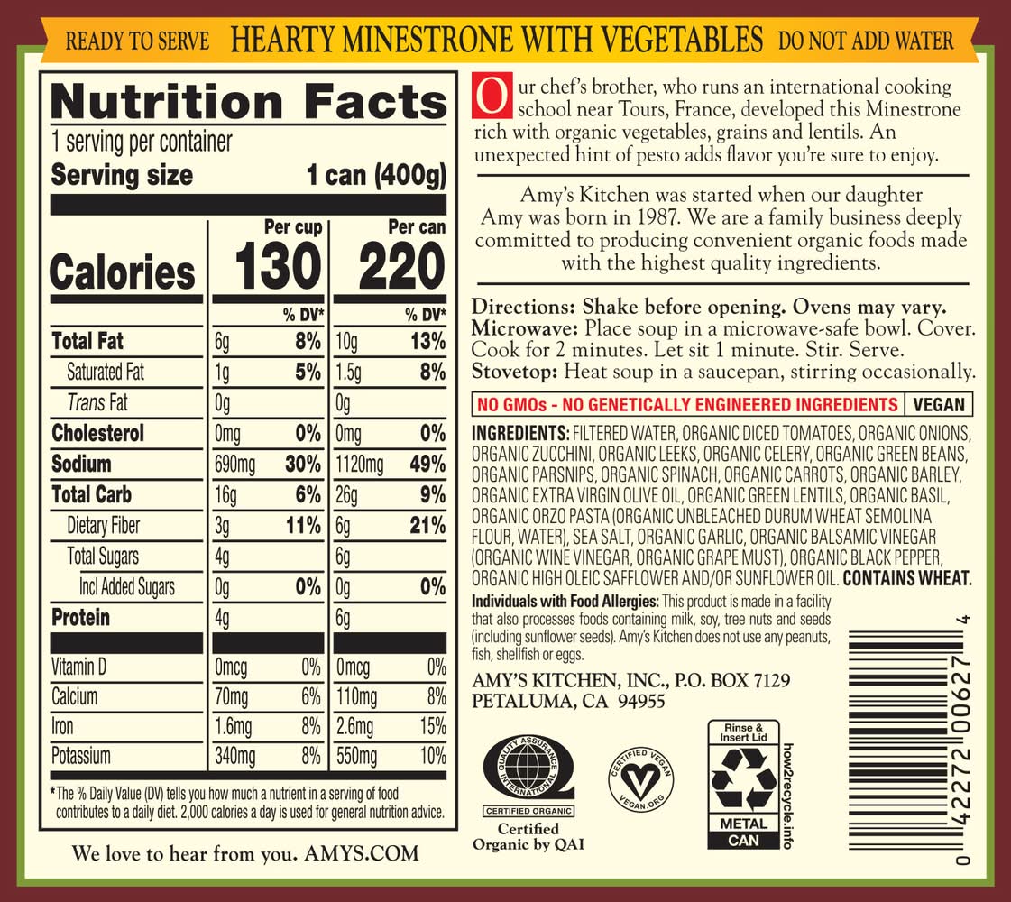 Hearty Minestrone with Vegetables Soup • Amy's Kitchen Inc., • Packaging: Reusable