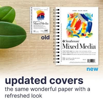 200 Series Strathmore Mixed Media paper is a medium weight, all-purpose paper in a sketching format. For use with dry and light, wet media sketching and practicing of techniques. Use this product with graphite, colored pencil, sketching stick, pen and ink, pastel, marker, and collage. Also good for light washes with watercolor or gouache. Size: 5.5x8.5 in
