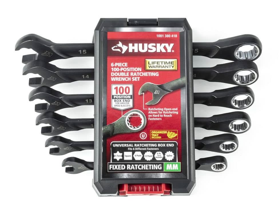 The dual-pawl technology on the Husky 100-Position Double Ratcheting Metric Wrench Set provides access to engage fasteners where other wrenches can't with its ultra-narrow, 3.6° swing arc box end. Its 10% longer beam provides increased reach for accessing hard-to-reach fasteners and improves overall leverage. The innovative open-end ratcheting design improves the speed of ratcheting and allows access of an open end without ever removing the wrench from the fastener.