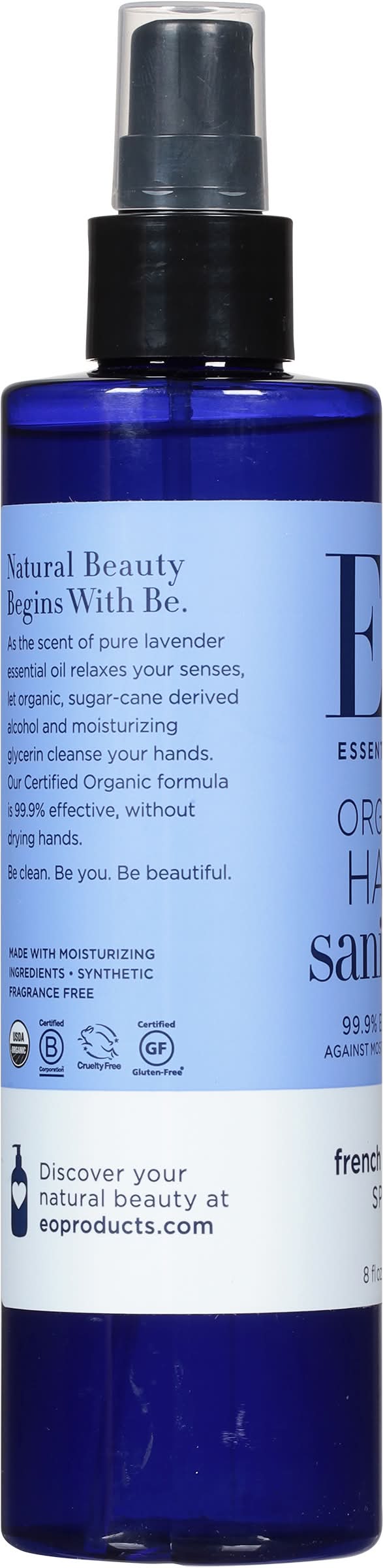 USDA Organic. Certified gluten free. Certified organic by CCOF. Essential oils. 99.9% effective against most common germs. Natural Beauty Begins With Be. As the scent of pure lavender essential oil relaxes your senses, let organic, sugar-cane derived alcohol and moisturizing glycerin cleanse your hands. Our Certified Organic formula is 99.9% effective, without drying hands. Be clean. Be you. Be beautiful. Synthetic fragrance free. eoproducts.com. Discover your natural beauty at eoproducts.com. Certified B Corporation. Cruelty free. Made in the USA from domestic & globally sourced components. EO Products, LLC,