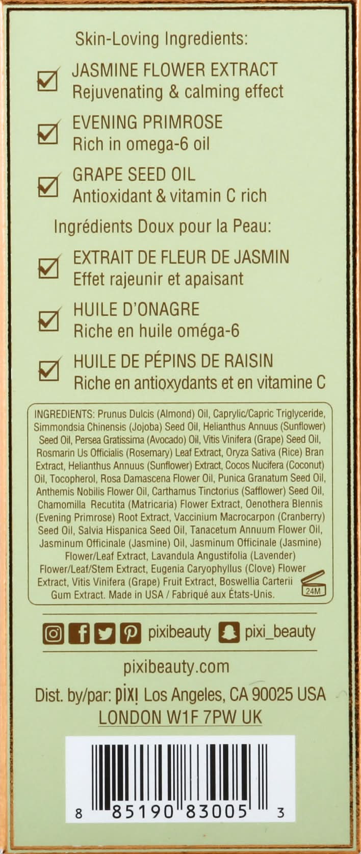 Skintreats since 1999. This exquisite oil blend is especially effective in helping skin recover from loss of moisture and dullness. It helps to calm and restore stressed and unbalanced skin. Skin-Loving Ingredients: Jasmine Flower Extract: Rejuvenating & calming effect. Evening Primrose: Rich in omega-6 oil. Grape Seed Oil: Antioxidant & vitamin C rich. pixibeauty.com. Instagram; Facebook; Twitter; Pinterest pixibeauty.com. Snapchat pixi(underscore)beauty. Made in USA. Pixi,