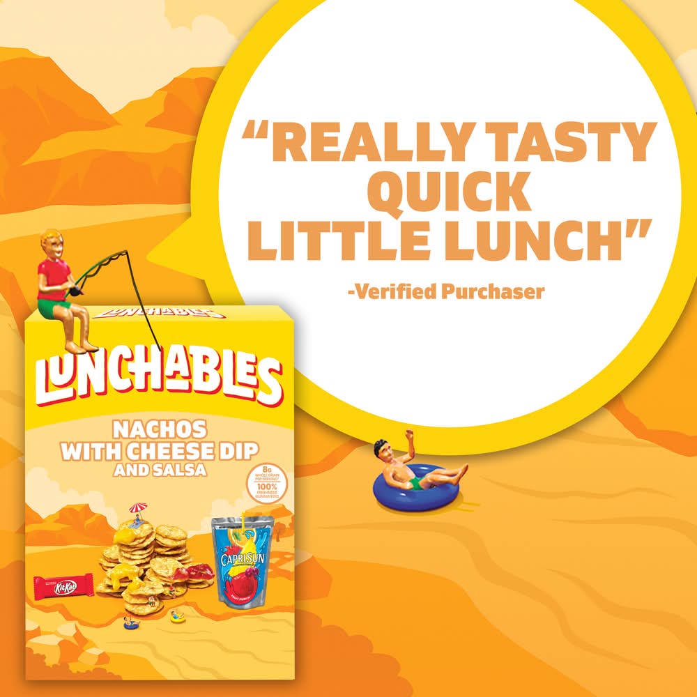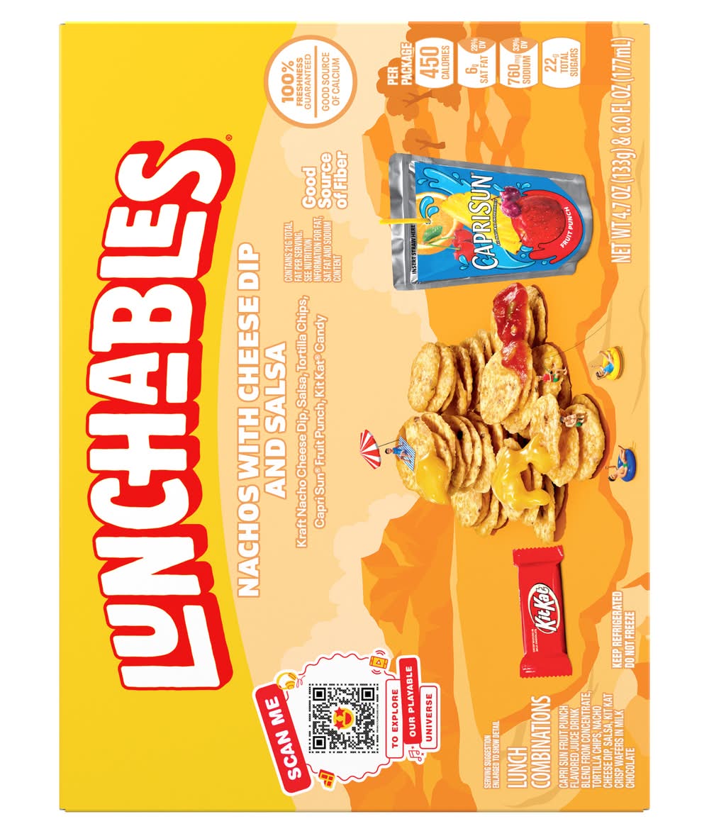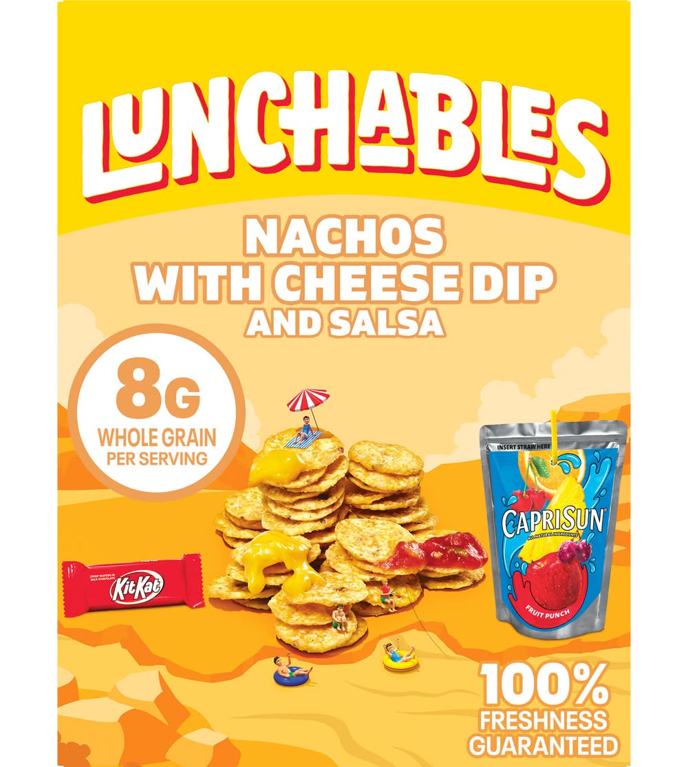 Powering kids forward, this Nacho Cheese Dip and Salsa Meal Kit is the perfect option for a convenient meal kids will enjoy any time of day! Our lunch kit features real, epic food including Kraft nacho cheese, salsa, tortilla chips, a juicy Capri Sun fruit punch drink and a delectable Kit Kat candy for a dessert treat. Great for on the go, each ingredient comes in its own individual compartment in our serving tray, making it easy and fun to build your own unique combinations. Every box contains a good source of vitamin C and calcium. Nacho Lunchables contains 4 grams of fiber per serving. Keep our convenient single-serve, on-the-go package refrigerated until it's time for school, lunchtime or everyday snacking. • Kraft Heinz Food Company, Chicago, IL, 60601 • Packaging: Reusable