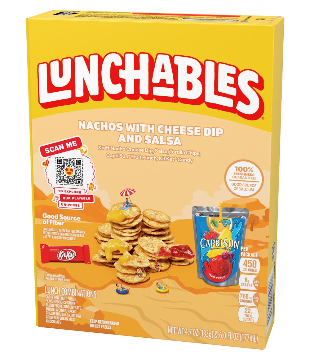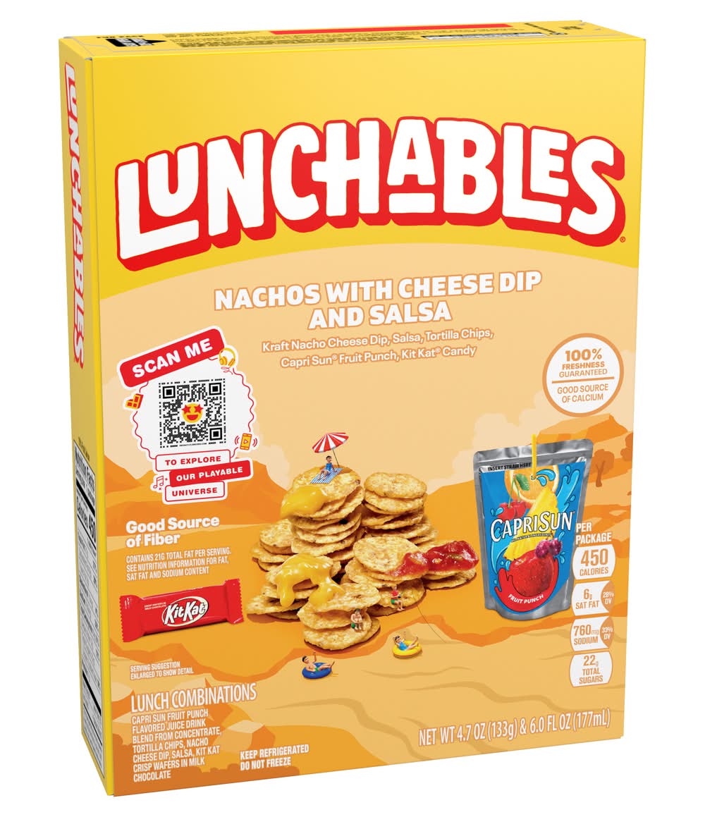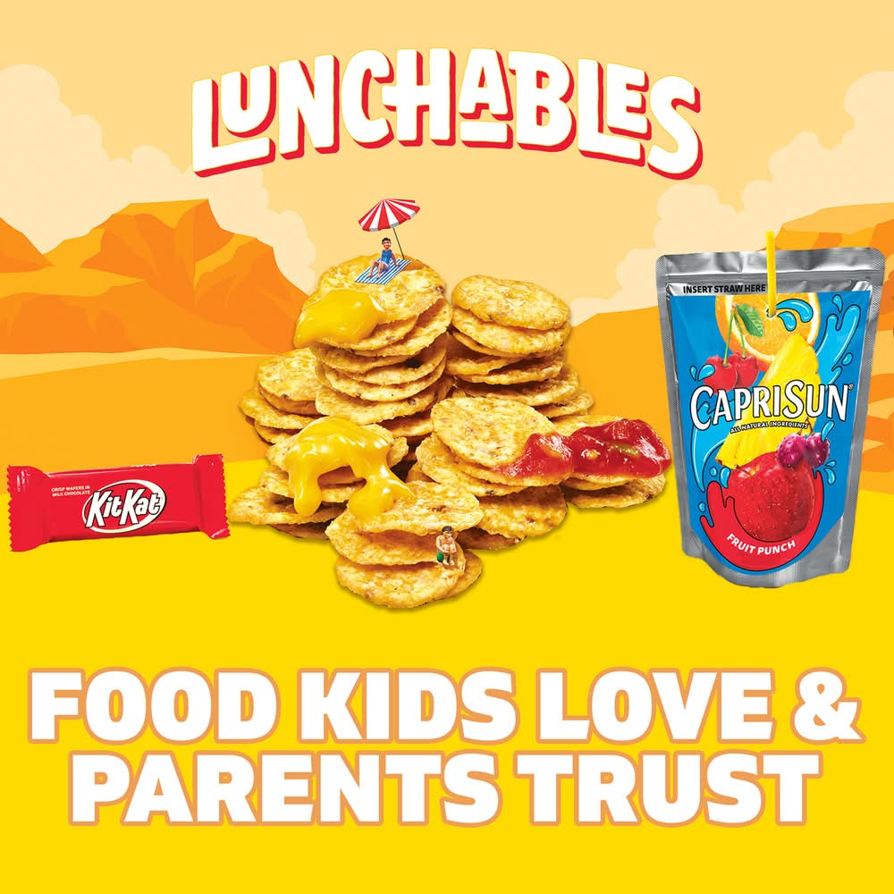 Powering kids forward, this Nacho Cheese Dip and Salsa Meal Kit is the perfect option for a convenient meal kids will enjoy any time of day! Our lunch kit features real, epic food including Kraft nacho cheese, salsa, tortilla chips, a juicy Capri Sun fruit punch drink and a delectable Kit Kat candy for a dessert treat. Great for on the go, each ingredient comes in its own individual compartment in our serving tray, making it easy and fun to build your own unique combinations. Every box contains a good source of vitamin C and calcium. Nacho Lunchables contains 4 grams of fiber per serving. Keep our convenient single-serve, on-the-go package refrigerated until it's time for school, lunchtime or everyday snacking. • Kraft Heinz Food Company, Chicago, IL, 60601 • Packaging: Reusable