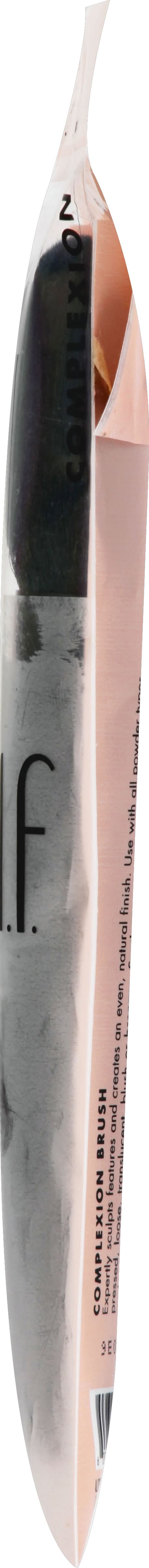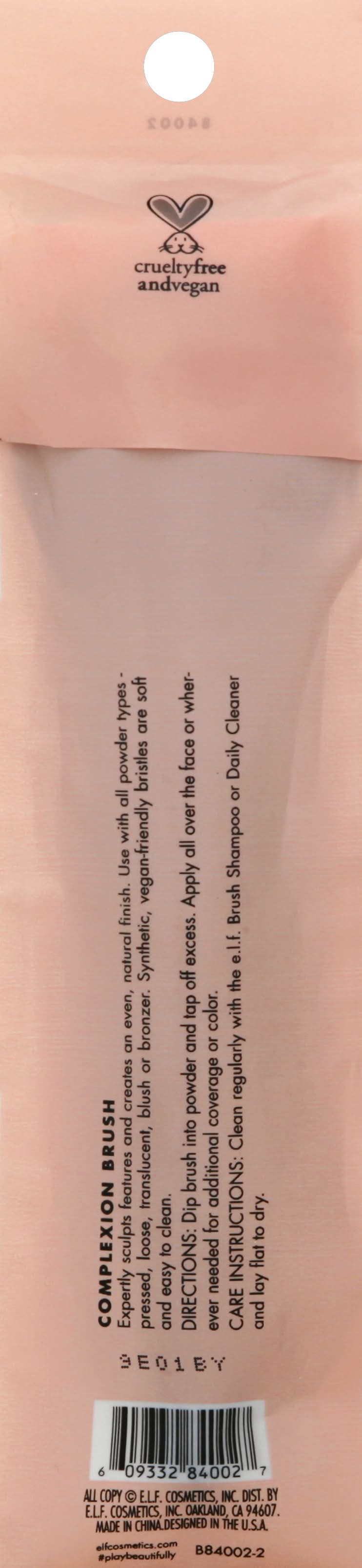 E.l.f. Complexion Brush is designed for sculpting features and creating an even, natural finish. Suitable for all types of powders, the brush can be used with pressed, loose, translucent, blush, and bronzer formulations. It features synthetic, vegan-friendly bristles that are soft and easy to clean. This brush is versatile, accommodating both wet and dry products, and it is recommended to clean or wipe the brush after each use. e.l.f. Cosmetics, Inc., Oakland, CA, 94607