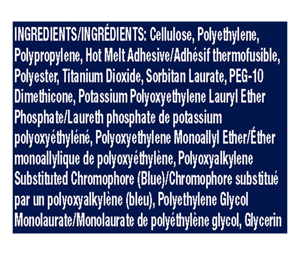 Ingredients: Cellulose, Polyethylene, Polypropylene, Hot Melt Adhesive, Polyester, Titanium Dioxide, Sorbitan Laurate, PEG-10 Dimethicone, Potassium Polyoxyethylene Lauryl Ether Phosphate, Polyoxyethylene Monoallyl Ether, Polyoxyalkylene Substituted Chromophore (Blue), Polyethylene Glycol Monolaurate, Glycerin