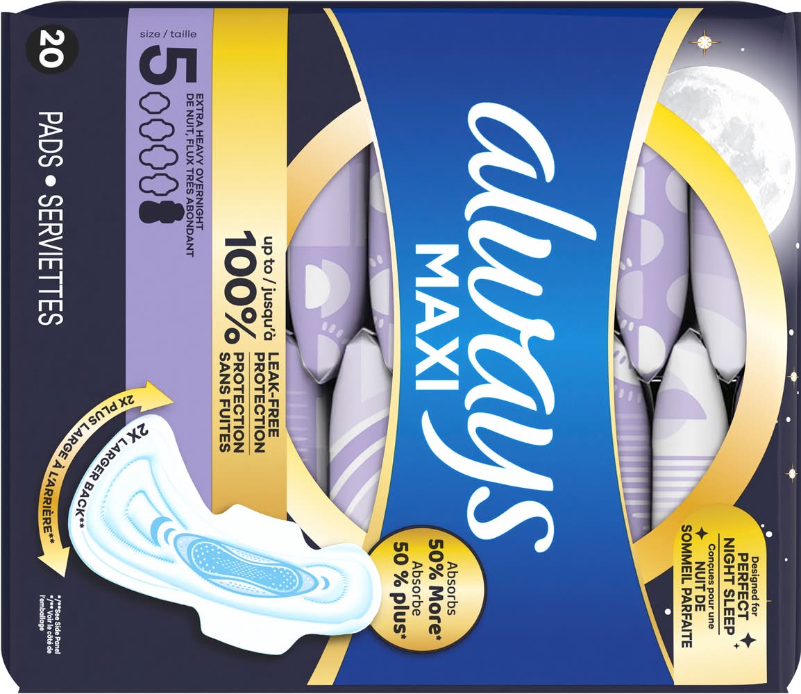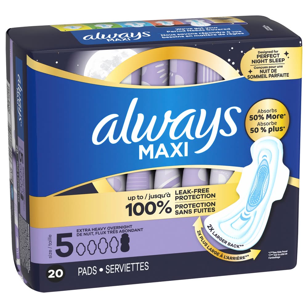 Rest easy with up to 100% leak-free comfort from the Always Maxi overnight pads. The pads feature advanced 3X Protection System to give you a worry-free night? sleep, while Rapid DRY works to wick away gushes in seconds. Plus, the pads? Leak GUARD core locks in leaks for long-lasting protection, while Securely FITS helps the pad stay in place throughout the night. Always Maxi Extra Heavy Extra Heavy Overnight Size 5 Pads Unscented with Wings feature a 2x larger back, so you're protected no matter how you sleep. Sleep tight with Always Maxi Pads. Are you getting the right protection from your pad? Did you know that 60% of women are wearing the wrong size pad? Using the wrong pad size can lead to leaks. Step up in size to help stop leaks. Now you can find your fit with ALWAYS My Fit, a tailored sizing system to help you find the best protection based on both your flow AND panty size. Use the sizing chart in the images to find your fit for day and night. • Size: 5 • female • Procter & Gamble, Cincinnati,OH,45202 • Packaging: Reusable