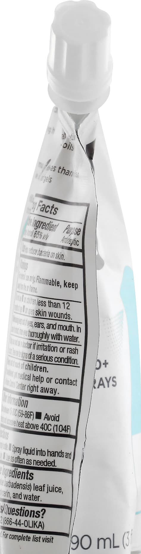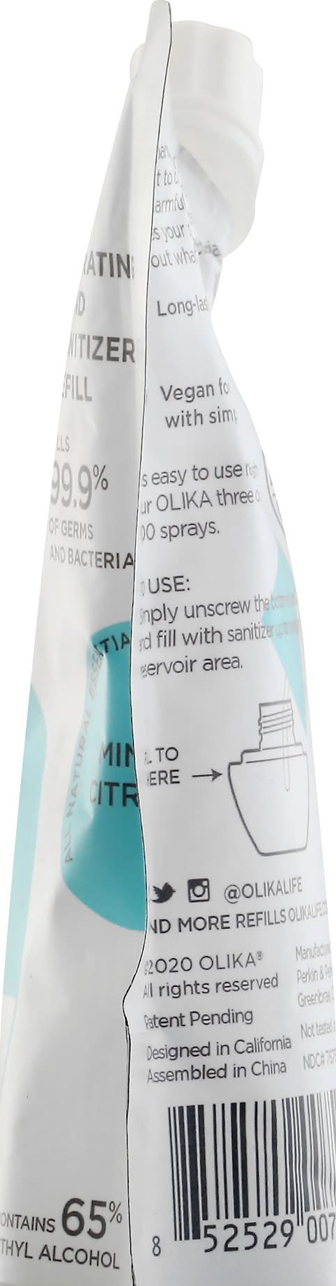 Other Information: Store between 15-30C (59-86F). Avoid freezing and excessive heat above 40C (104F). Contains 65% ethyl alcohol. 1500+ sprays. Kills 99.9% of germs and bacteria. All natural essential oils. Clean hands. No cracks. If your hand sanitizer dries out of your skin and causes it to crack or peel, it could be exposing you to harmful bacteria. Olika hydrates and soothes your skin while removing germs and bacteria. Long-lasting hydration. Aromatherapeutic essential oils. Vegan formulation with simple ingredients. 15x more uses than similar sized gels. This easy to use refill pouch will replenish your Olika three or four times for over 1500 sprays. olikalife.com. Facebook. Twitter. Instagram. (at)olikalife. Find more refills olikalife.com. Comments/questions? (866) 446-5452. (866-44-OLIKA). For complete list visit olikalife.com. Comments/Questions? (866) 446-5452 (866-44-OLIKA). For complete list visit olikalife.com. Not tested on animals. Designed in California. Assembled in China. Perkin & Perkin, Greenbae, CA, 94904, Ph: 866-446-5452