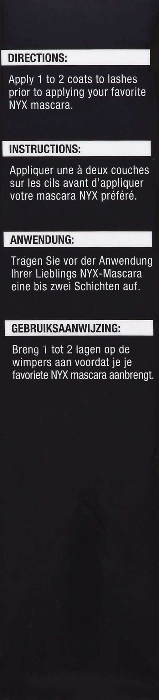Apply 1 to 2 coats to lashes prior to applying your favorite NYX mascara. Good for 6 months once opened.