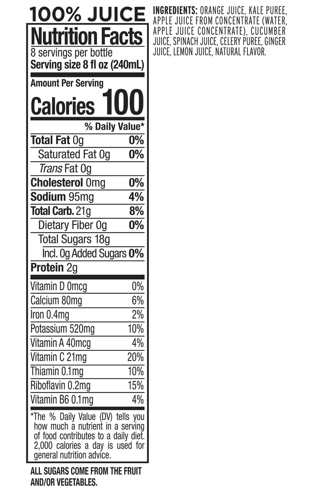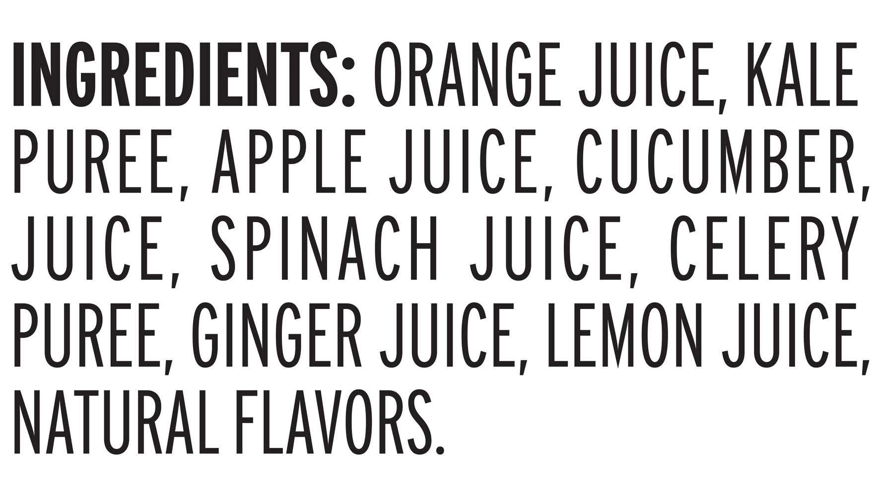 Orange Juice, Kale Puree, Apple Juice From Concentrate (Water, Apple Juice Concentrate), Cucumber Juice, Spinach Juice, CELERY Puree, Ginger Juice, Lemon Juice, Natural Flavor.. Contains: None Additives: None