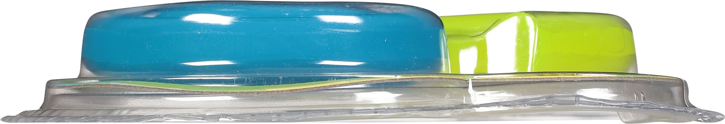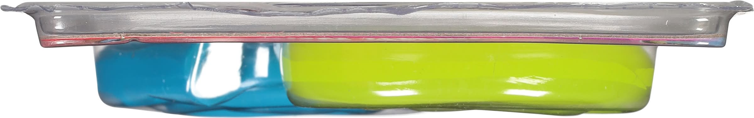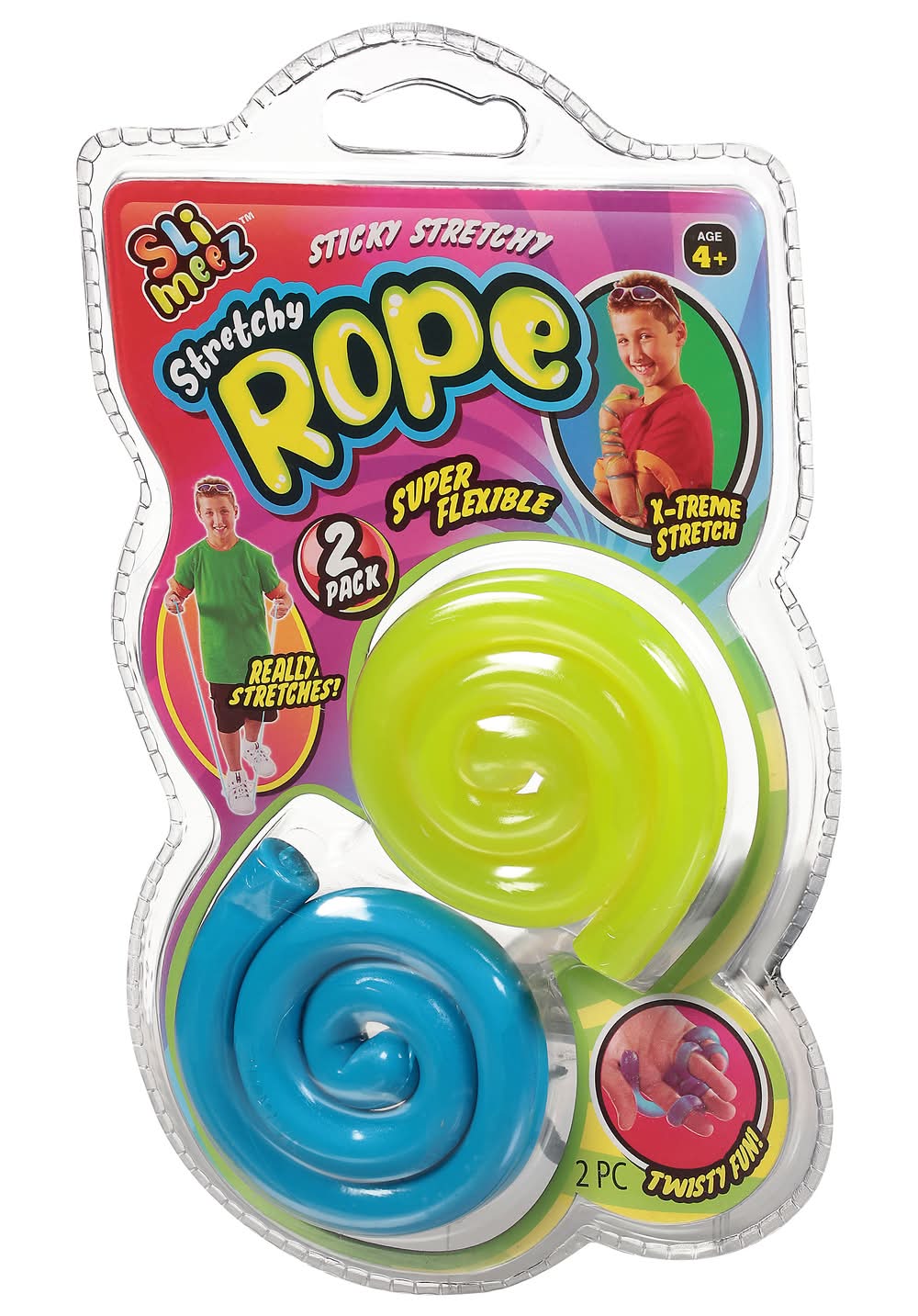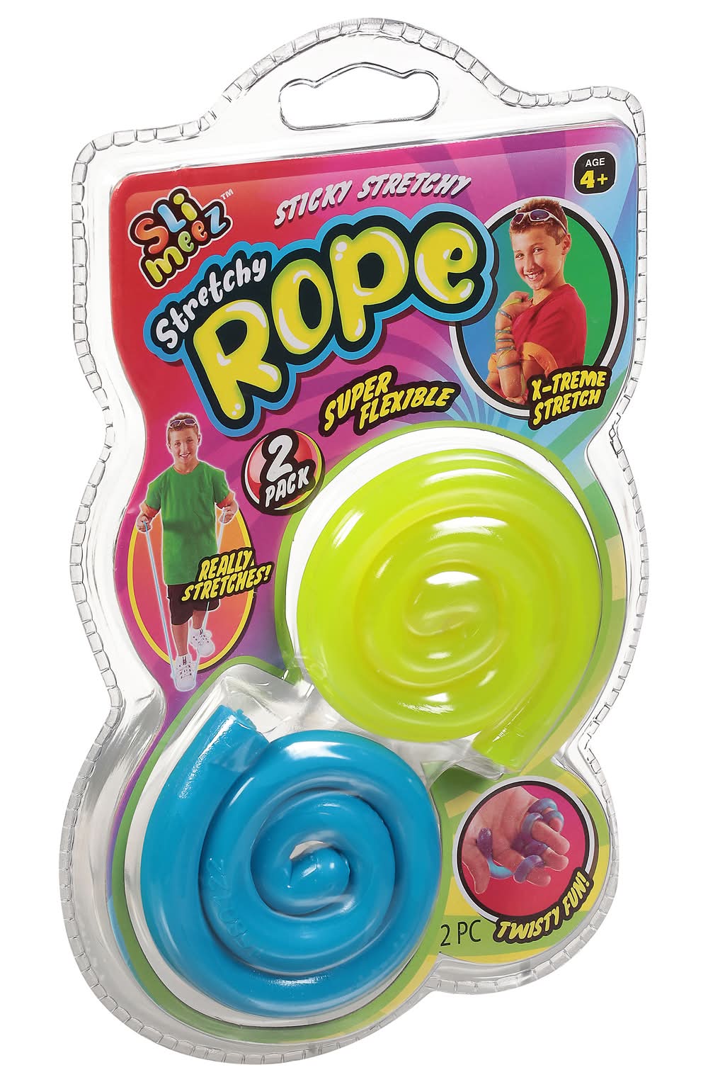 Ages 4+. 5 x 9. Sli Meez. Sticky stretchy. Super flexible. x-tream stretch. Really stretches! Twisty fun! Washable! Conform to the safety requirements of ASTM F963. The Toy Association. Made in China. • Ja-Ru Inc, • Packaging: Reusable