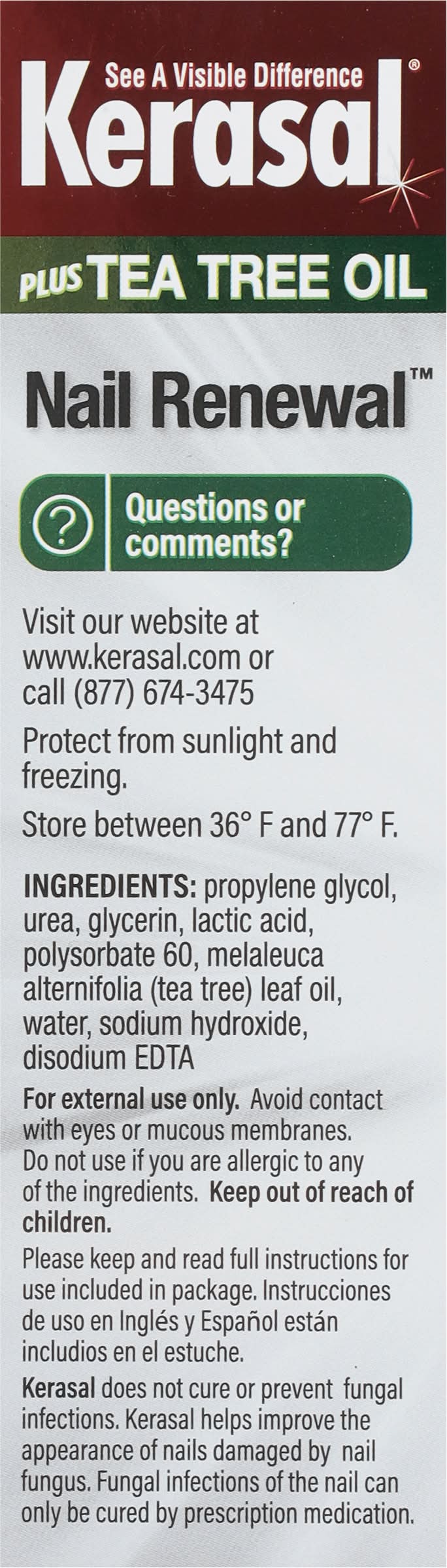 Fungal nail repair solution. Enriched with natural tea tree oil. No.1 Dr. recommended brand (Brand most often recommended among cosmetic options to patients for improving the appearance of nails damaged by a fungal infection). See a visible difference. Drug free. Preservative free. Paraben free. Precision brush. Reduces discoloration & thickness. Hydrates & exfoliates. Clinically proven ingredients. Kerasal, the number one brand for nail renewal, is now infused with Natural Tea Tree Essential Oil. Tea Tree oil has been used for hundreds of years as an all-natural soothing ingredient. The Tea Tree oil in Kerasal is steam distilled from the leaves of the Melaleuca Alternifolia Tree. It has a distinctive and revitalizing aroma. Kerasal's unique blend of ingredients helps reduce discoloration, helps normalize thickness, hydrate and exfoliate dry, brittle nails. Kerasal's effective formula penetrates the nail and improves their appearance, providing results you can see! Free From: Preservatives, Parabens, Phthalates. Infused with natural tea tree oil. Deep penetrating formula. Easy to use precision brush. www.kerasal.com. Questions or comments? Visit our website at www.kerasal.com or call (877) 674-3475. Not tested on animals. Made in the USA. Advantice Health, Llc, Cedar Knolls, NJ