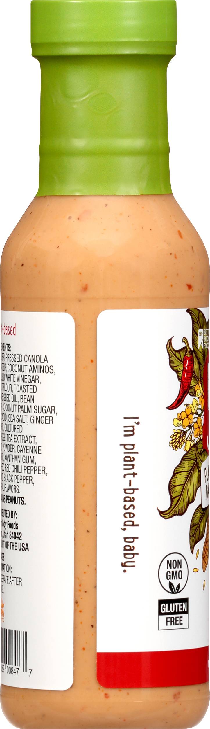 Made with 100% expeller pressed canola oil. Gluten free. Non GMO. Plant-based. I'm plant-based, baby. www.plantjunkie.com. BPA free. Product of the USA. BetterBody Foods,