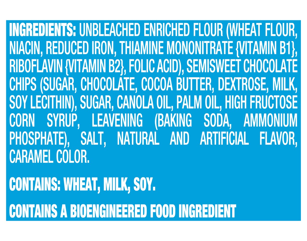 Ingredients: INGREDIENTS: UNBLEACHED ENRICHED FLOUR (WHEAT FLOUR, NIACIN, REDUCED IRON, THIAMINE MONONITRATE {VITAMIN B1}, RIBOFLAVIN {VITAMIN B2}, FOLIC ACID), SEMISWEET CHOCOLATE CHIPS (SUGAR, CHOCOLATE, COCOA BUTTER, DEXTROSE, MILK, SOY LECITHIN), SUGAR, SOYBEAN AND, OR CANOLA OIL, PALM OIL, HIGH FRUCTOSE CORN SYRUP, LEAVENING (BAKING SODA, AMMONIUM PHOSPHATE), SALT, NATURAL AND ARTIFICIAL FLAVOR, CARAMEL COLOR.CONTAINS: WHEAT, MILK, SOY. Contains: Wheat, Milk, Soy