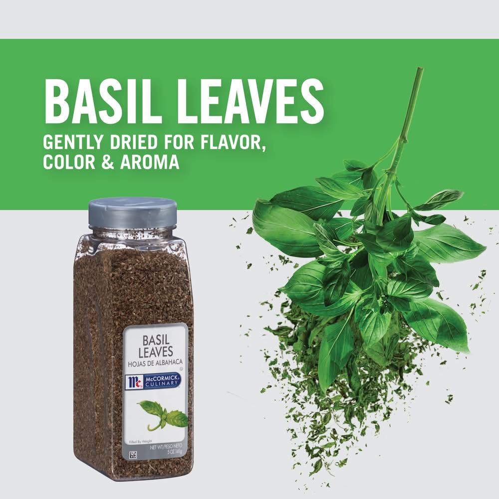 McCormick Culinary Basil Leaves are carefully harvested and dried to retain natural color and aroma and deliver exceptional flavor in your next culinary creation.