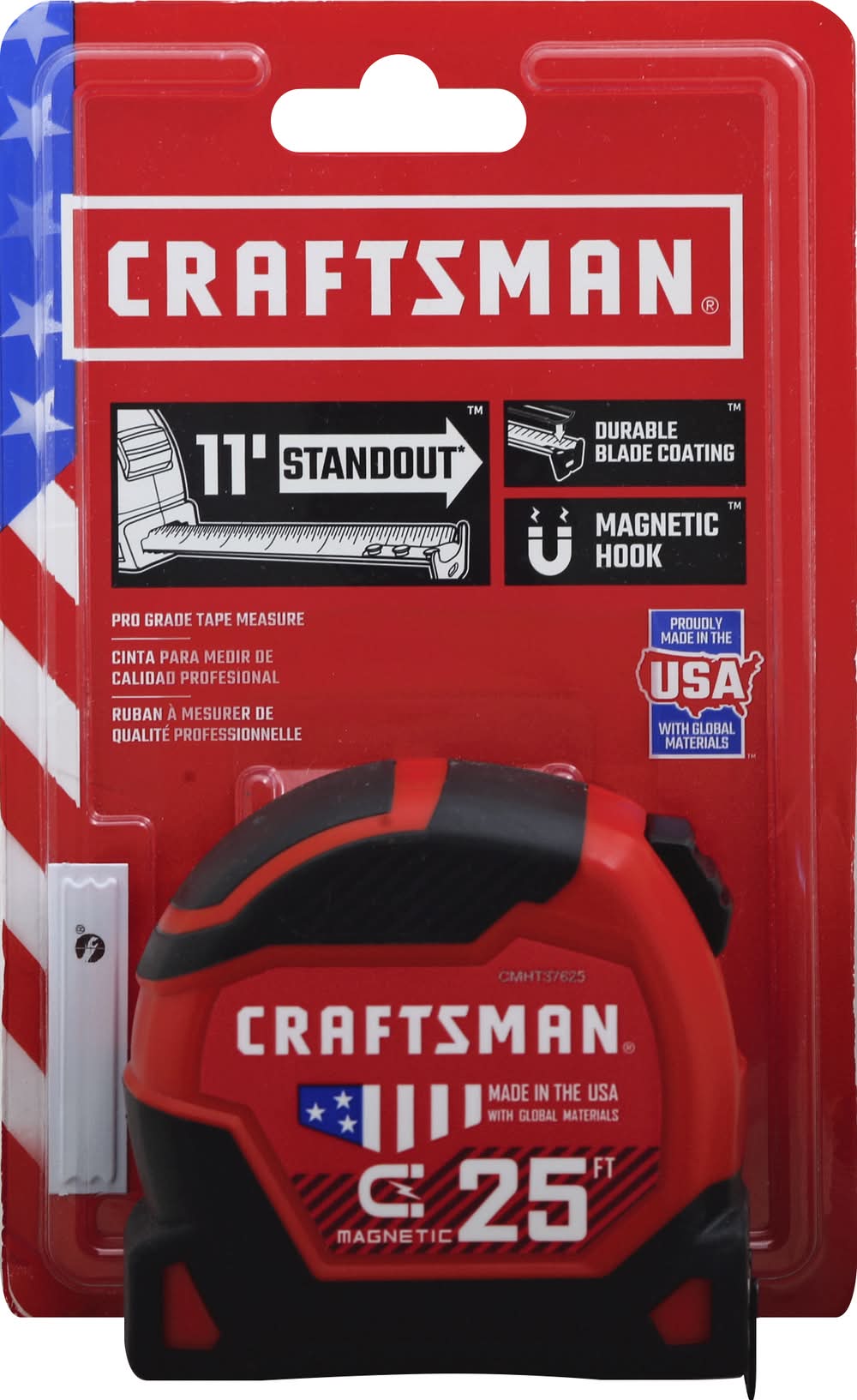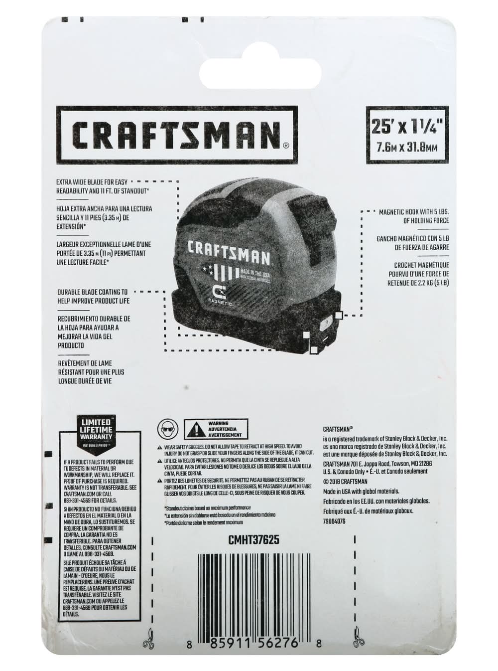 11 in Standout. Durable Blade Coating. Magnetic Hook. 25 ft x 1 1/4 in. 7.6 m x 31.8 mm. Extra wide blade for easy readability and 11 ft. of standout (Standout claims based on maximum performance). Durable blade coating to help improve product life. Magnetic Hook with 5 lbs of holding force. Limited lifetime warranty: If a product fails to perform due to defects in material or workmanship, we will replace it, Proof of purchase is required. Warranty is not transferable. See craftsman.com or call 888-331-4569 for details. craftsman.com Proudly made in the USA with global materials. Craftsman,