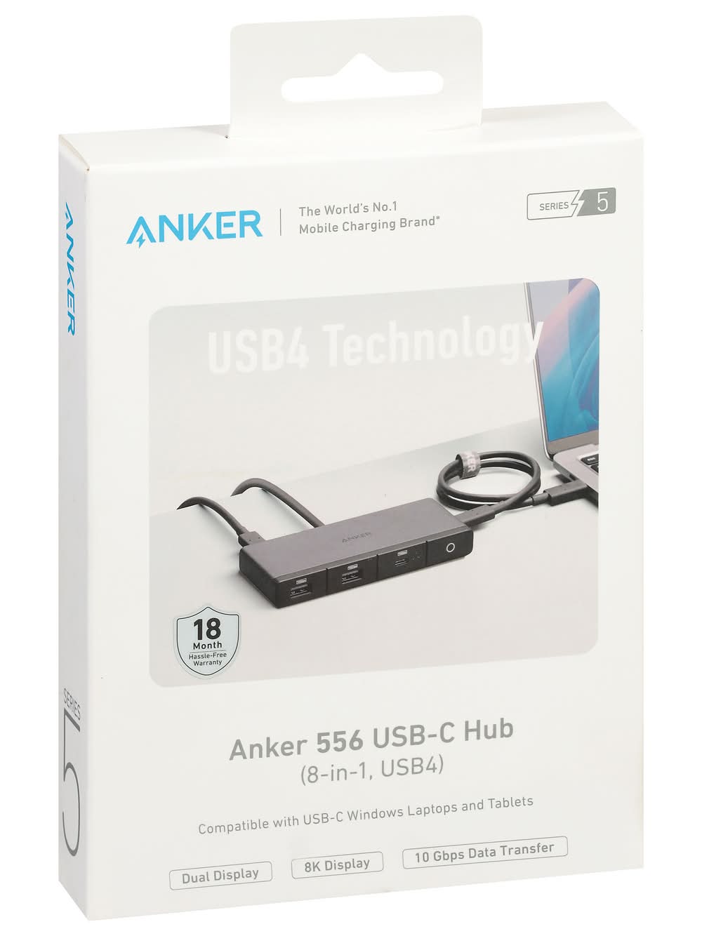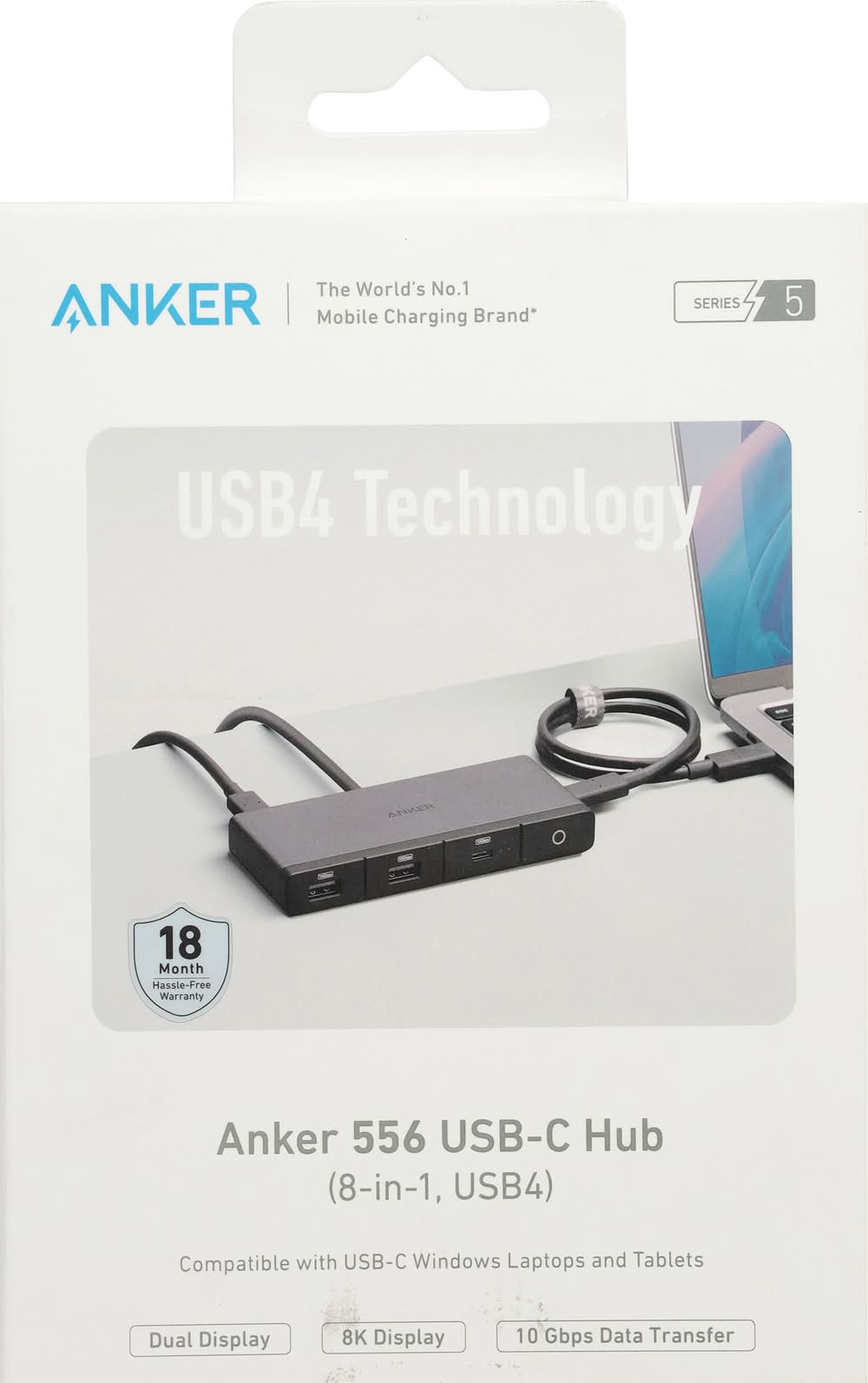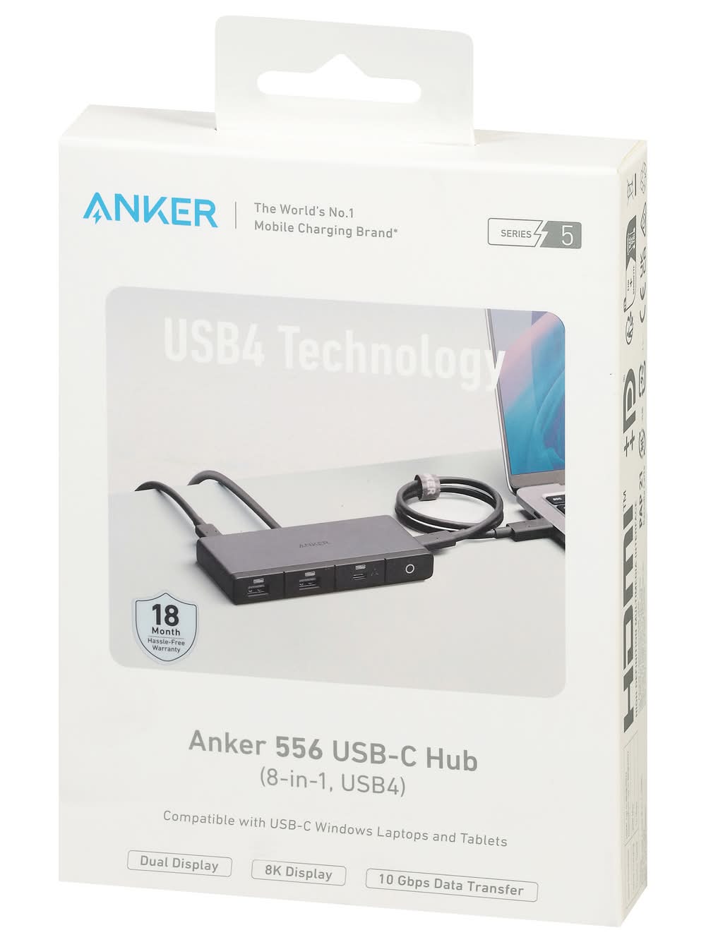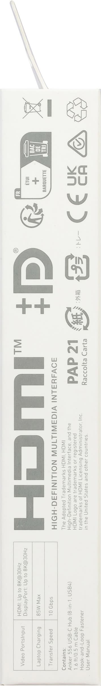 Contains: Anker 556 USB-C hub (8-in-1, USB4). 1.6 ft/0.5 m cable. Hook-and-loop fastener. User manual. The world's no. 1 mobile charging brand (in terms of retail sales value in 2020). (8-in-1, USB4). Dual display. 8K display. 10 Gbps data transfer. Live charged. 80 M: The choice of 80 million + happy users worldwide. Fast-charging via leading technology. Hassle-free warranty. HDMI (8D (at)30Hz). DisplayPort (8K (at)30Hz). Ethernet. PD-IN (Up to 100W). Power indicator. USB-C (10 Gbps). USB-A (10 Gbps). USB4 Technology: Features the latest USB4 protocol for future-proof compatibility. Dual display: Connect to 2 external monitors via 1 HDMI port and display port. 1.6 pt (0.5 m) cable: The included cable gives you greater flexiblility to move the hub around your desk. Data source: Euromonitor International (Shanghai) Co., Ltd., measured in terms of retail sales value in 2020, based on research conducted in 11-2021. Brands are defined as mobile charging brands if more than 75% of their retail sales are contributed by mobile phone charging products. Mobile phone charging products include chargers wireless chargers. power banks, and charging cables, and these accessories can also be used for other consumer electronics devices. Video Portsinput: HDMI: Up to 8K(at)30Hz DisplayPort: Up to 8K(at)30Hz. Laptop charging: 85W Max. Transfer speed: 10 Gbps. Contains: Anker 556 USB-C Hub (8-in-1, USB4); 1.6 ft/0.5 m cable. Hook-and loop Fastener; User manual. CE listed. UK CA listed. We hope you never have the need, but if you do, our service is friendly and hassle-free. (US) +1 (800)988 7973, (UK) +44(0)1604 936200, (DE) +49 (0) 69 9579 7960, support@anker.com (Global). Made in China.