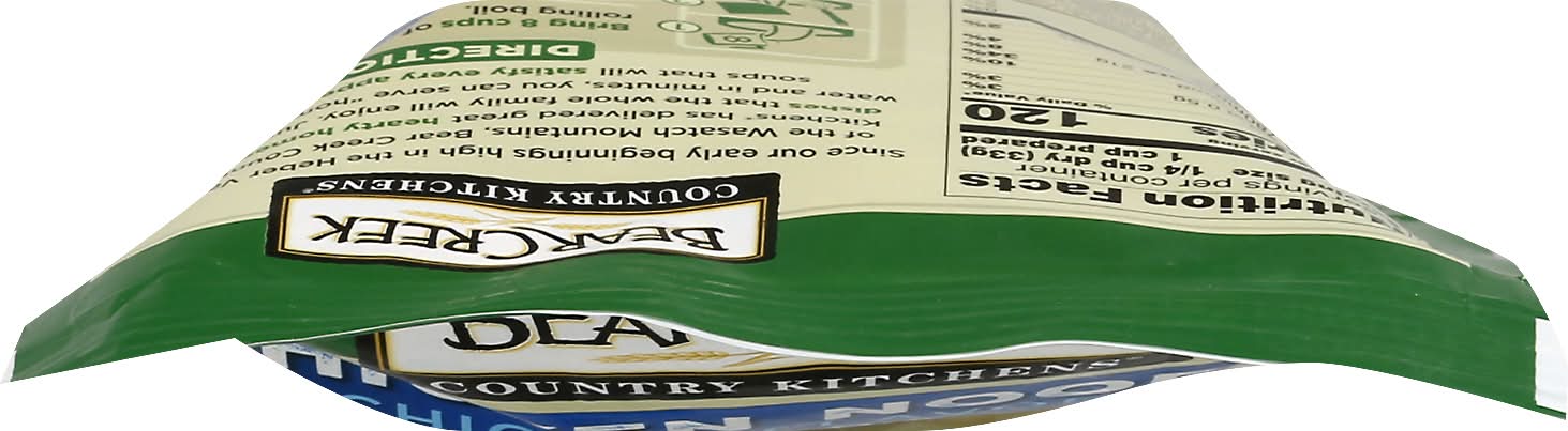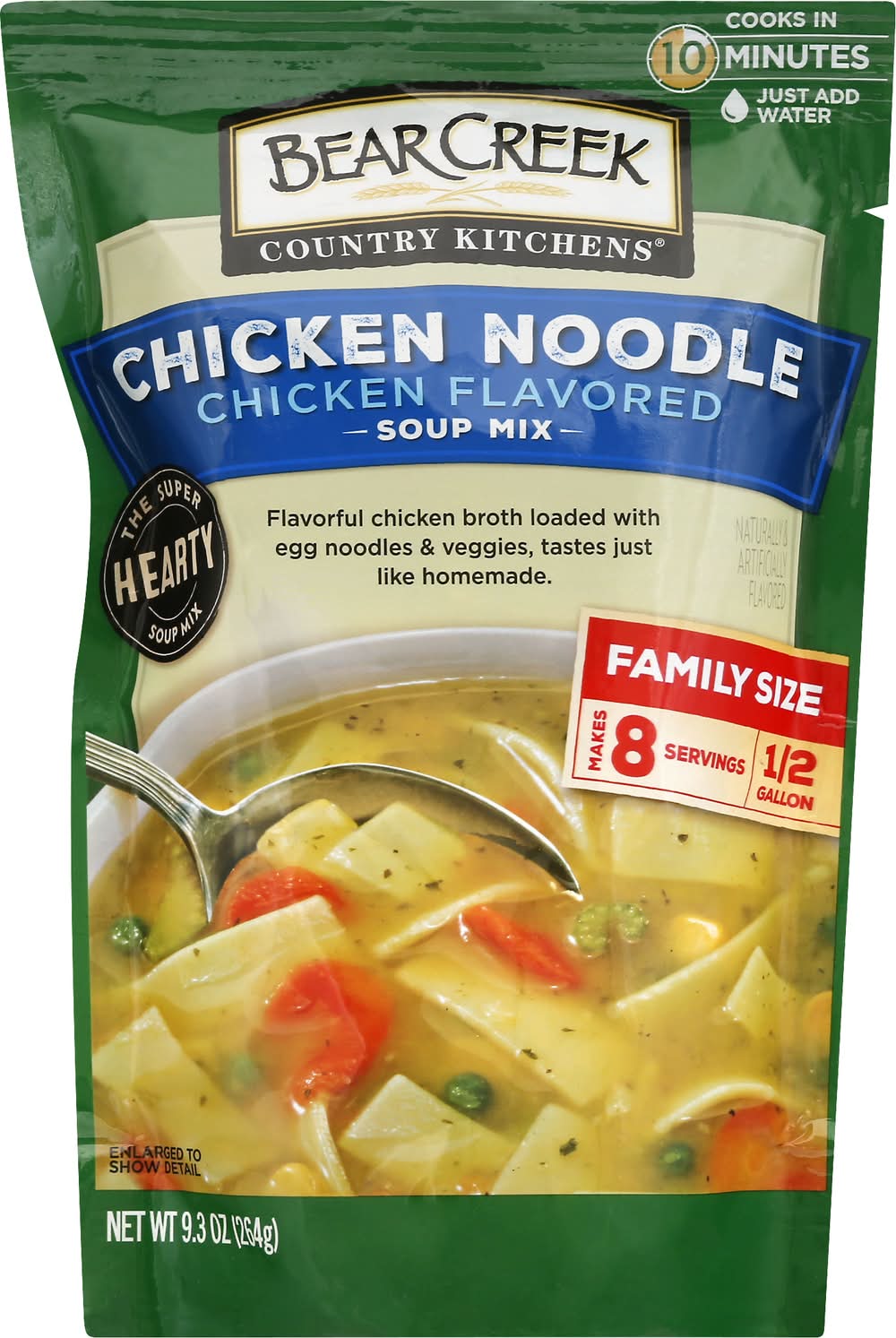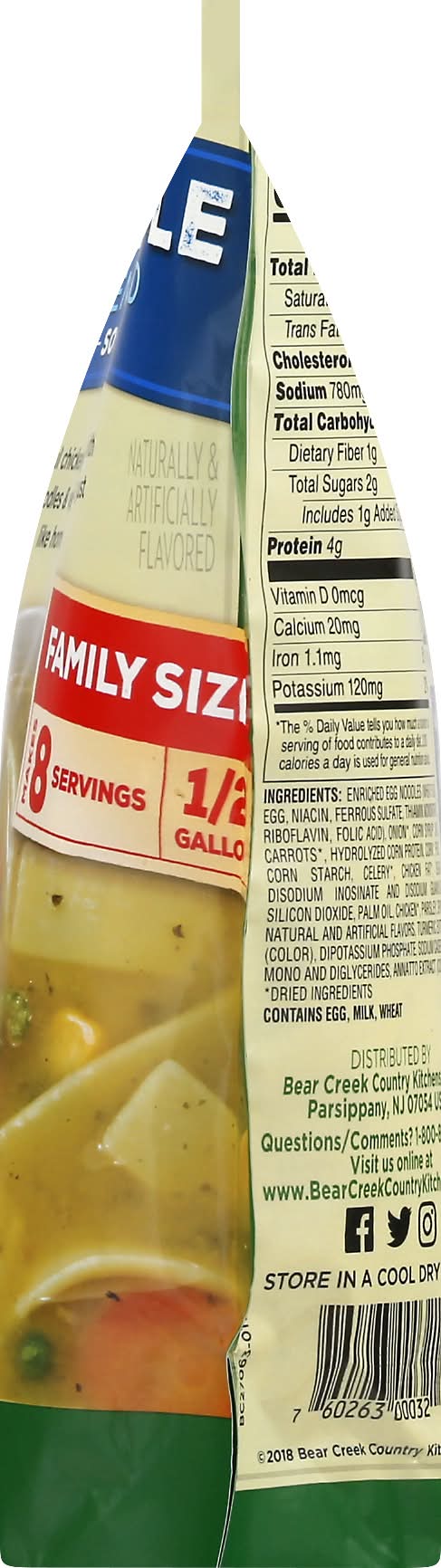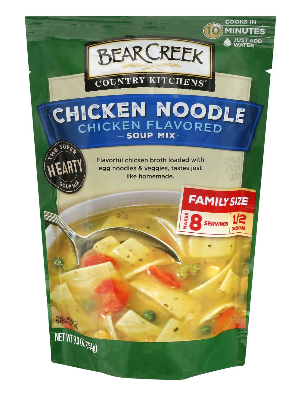 Chicken flavored. Naturally artificially flavored. Makes 8 servings. 1/2 gallon. The super hearty soup mix. Flavorful chicken broth loaded with egg noodles & veggies, tastes just like homemade. Since our early beginnings high in the Heber Valley of the Wasatch Mountains, Bear Creek Country Kitchens has delivered great hearty homestyle dishes that the whole family will enjoy. In a few simple steps, you can serve homemade soups that will satisfy every appetite. www.BearCreekCountryKitchens.com. Facebook. Twitter. Instagram. Questions/comments? 1-800-813-3654. Visit us online at www.BearCreekCountryKitchens.com. Bear Creek Country Kitchens, LLC, Parsippany,NJ,07054