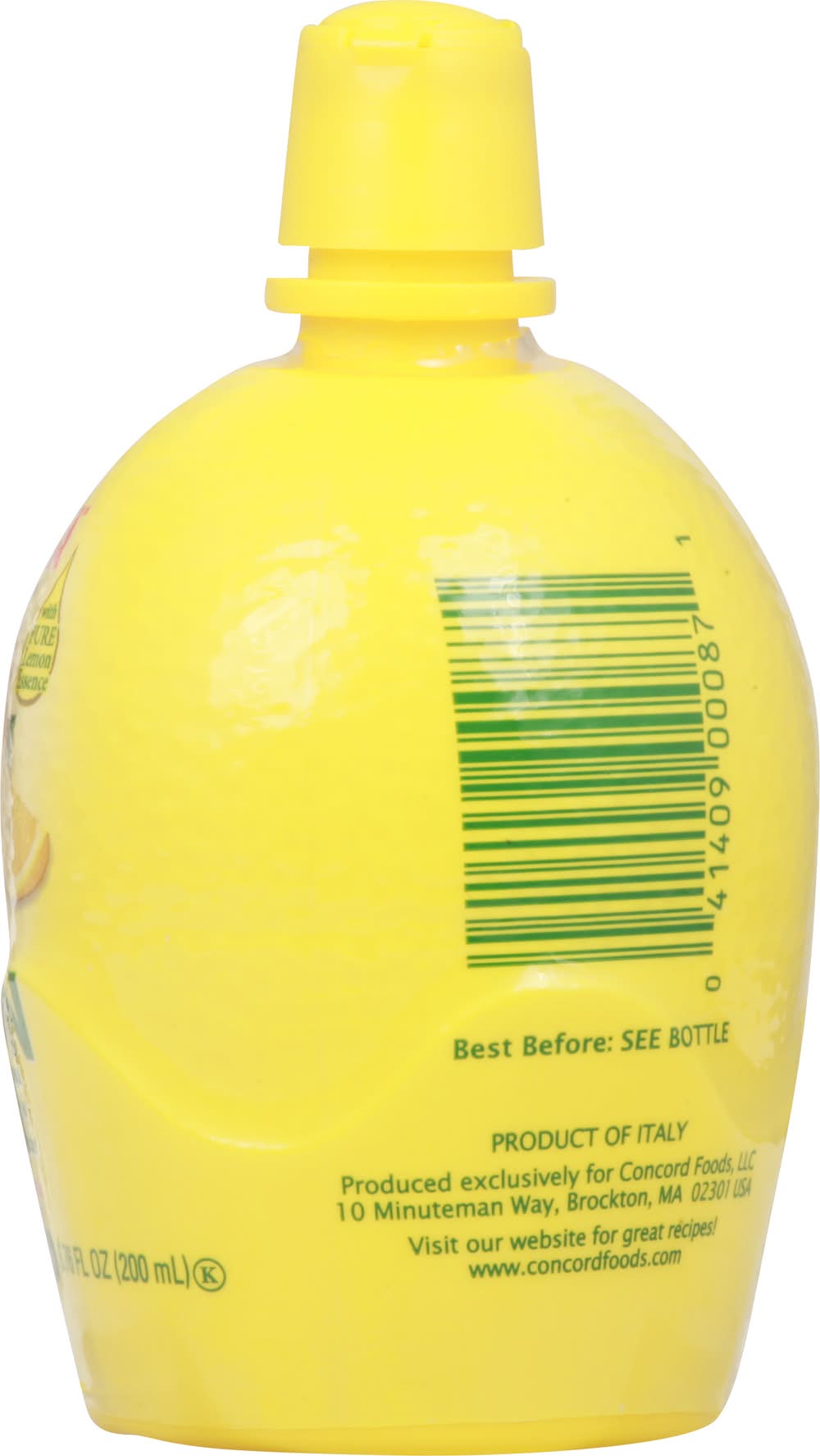 With pure lemon essence. Not from concentrate selected by concord foods. www.concordfoods.com. Visit our website for great recipes! www.concordfoods.com. Product of Italy. • Concord Foods, • Packaging: Reusable