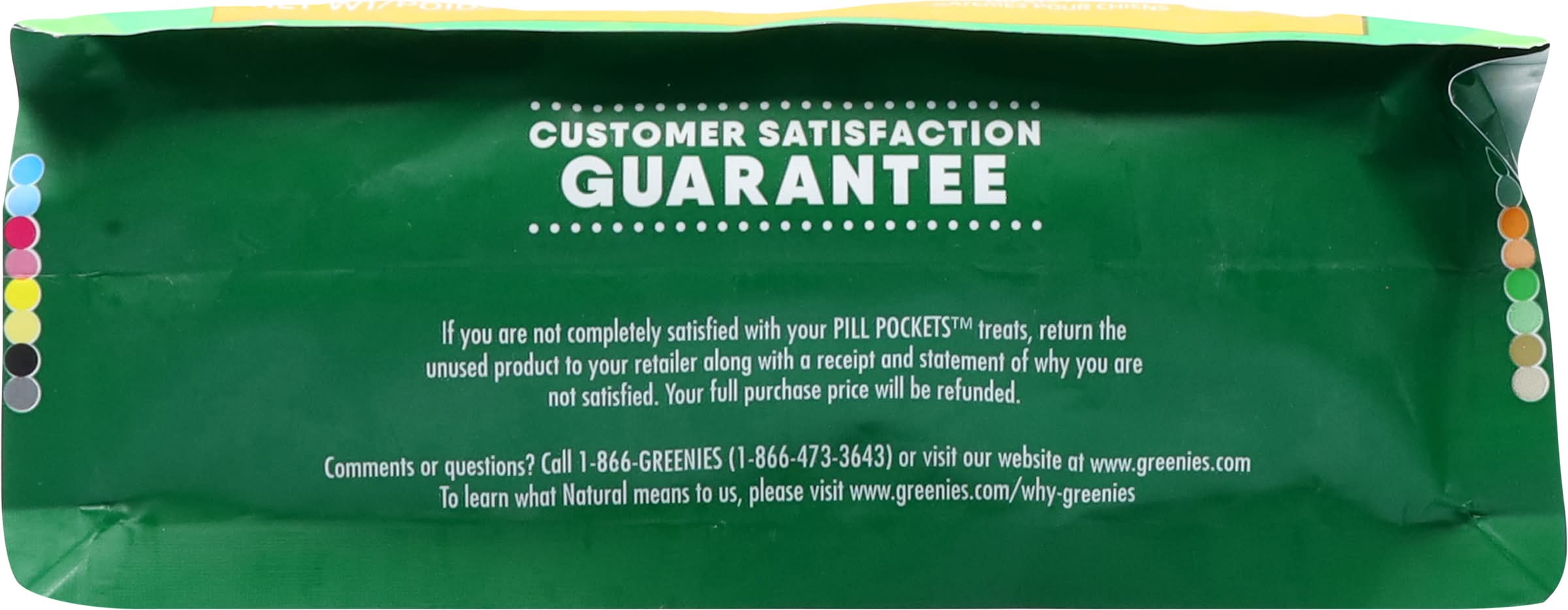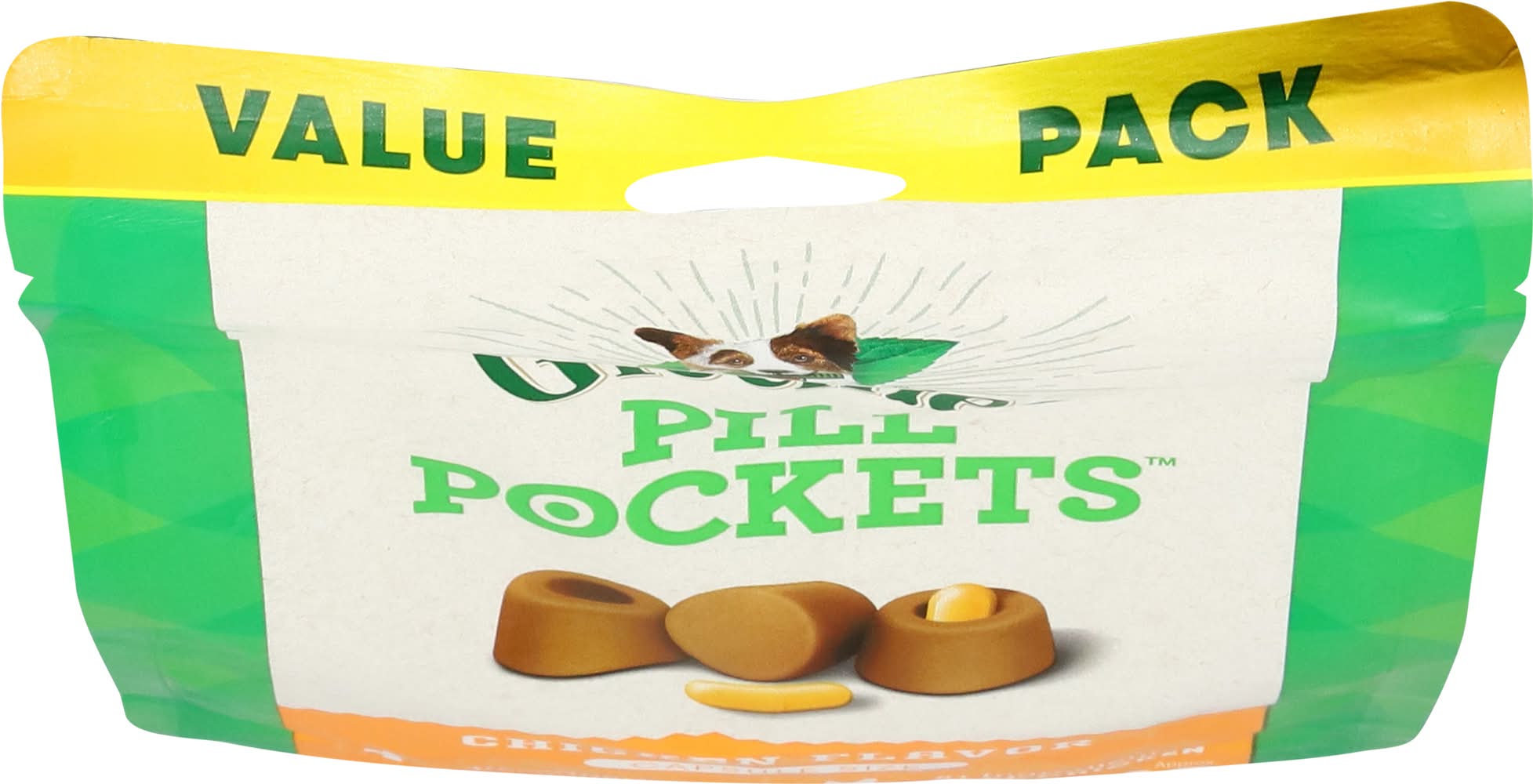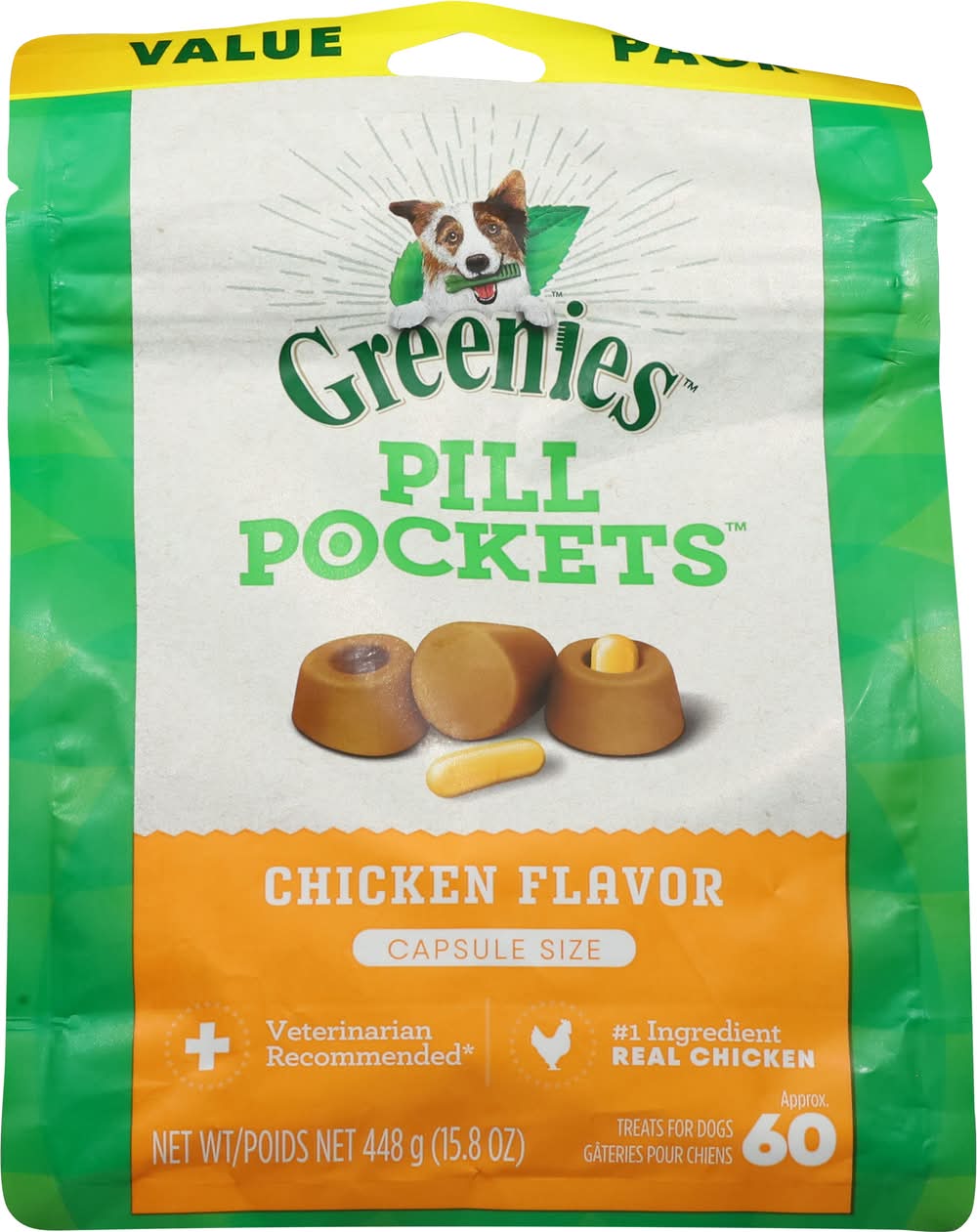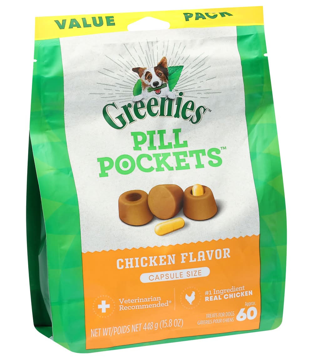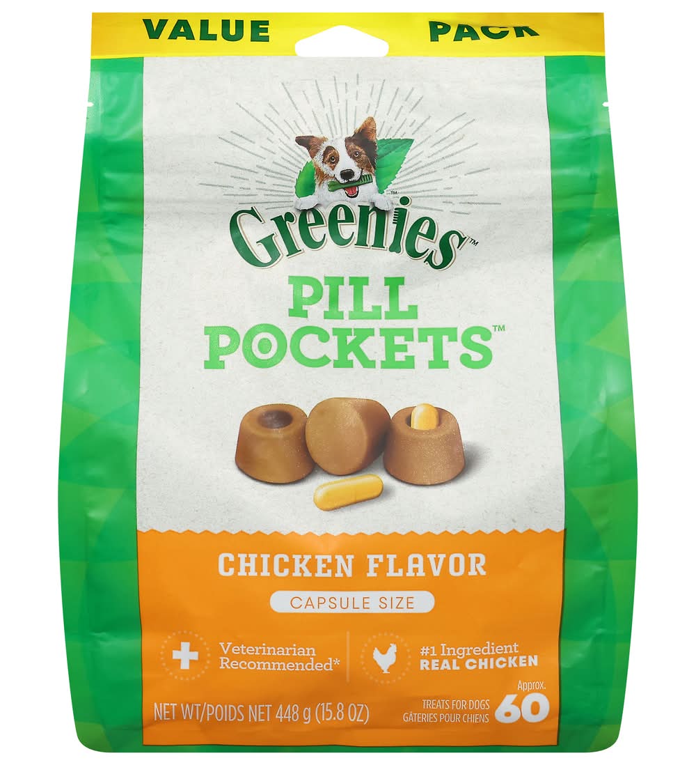 Veterinarian recommended. Approx. 60. Pill Pockets treats are an easy, proven solution for giving medicine to your dog. The built-in pouch and shapeable texture are perfect for hiding medicine - so your dog gets the medicine they need - and a tasty treat they will love! It’s the hassle-free way to give medicine - just fill, pinch & give! Not valid for sale in Quebec. Customer Satisfaction Guarantee: If you are completely satisfied with your Pill Pockets treats, return the unused product to your retailer along with a receipt and statement of why you are not satisfied. Your full purchase price will be refunded. www.greenies.com. www.greenies.com/why-greenies. Comments or questions? Call 1-866-Greenies (1-866-473-3643) or visit our website at www.greenies.com. To learn what Natural means to us, please visit www.greenies.com/why-greenies. Proudly crafted in USA facilities with quality ingredients from around the world.
