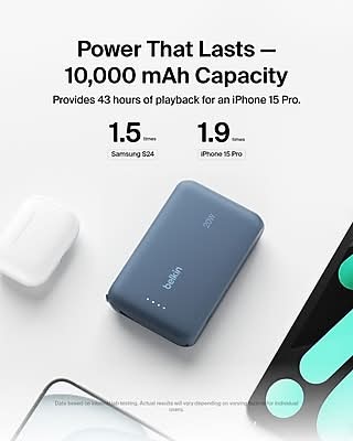 Fast portable power. Plug in with the integrated USB-C cable and quickly charge on-the-go with up to 20W. Charge up to 20W with our lightweight 10K§ power bank. Its integrated USB-C® cable design offers a convenient on-the-go fast charging experience without carrying a cable. A USB-C port allows charging of a second device at the same time. - Integrated USB-C cable - 20W output to fast charge your smartphones and tablets - 10K battery capacity provides 43 hours of playback for an iPhone 15 Pro - Charges two devices at the same time - LED shows battery status - Pass-through power allows for charging a device while the power bank recharges - Compact, lightweight design - Plastic-free packaging - Housing (excluding cable) made from 72% PCR material - 2-year warranty and $2,500 Connected Equipment Warranty Packaging: Reusable