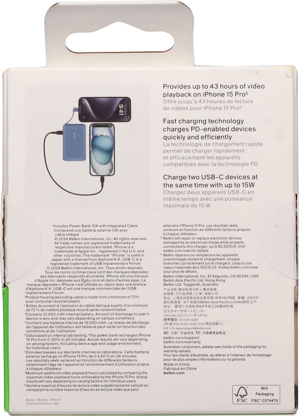 Fast portable power. Plug in with the integrated USB-C cable and quickly charge on-the-go with up to 20W. Charge up to 20W with our lightweight 10K§ power bank. Its integrated USB-C® cable design offers a convenient on-the-go fast charging experience without carrying a cable. A USB-C port allows charging of a second device at the same time. - Integrated USB-C cable - 20W output to fast charge your smartphones and tablets - 10K battery capacity provides 43 hours of playback for an iPhone 15 Pro - Charges two devices at the same time - LED shows battery status - Pass-through power allows for charging a device while the power bank recharges - Compact, lightweight design - Plastic-free packaging - Housing (excluding cable) made from 72% PCR material - 2-year warranty and $2,500 Connected Equipment Warranty Packaging: Reusable