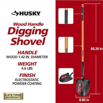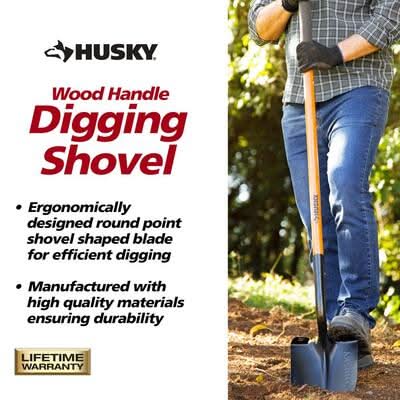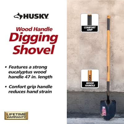 The Husky 47 in. L Wood Handle Carbon Steel Digging Shovel with Grip is the ideal gardening tool for all your digging and soil transferring needs. Crafted with a full-tempered carbon steel blade, this versatile digging shovel provides outstanding performance. This shovel boasts a robust eucalyptus hardwood handle, renowned for its increased strength, endurance, and longevity. The handle is coated with a protective, high-quality varnish to further enhance durability and provide a smooth, comfortable feel when in use. A wider footstep allows for maximum force and efficiency when penetrating and maneuvering through stubborn soil, minimizing strain on your body, and ensuring optimal productivity on your gardening and landscaping projects. An ergonomically designed soft grip provides a secure hold and minimizes hand fatigue, even during extended periods of use. At Husky, we stand behind the quality and durability of our products, which is why we offer a manufacturer lifetime warranty. Size: 47 In.