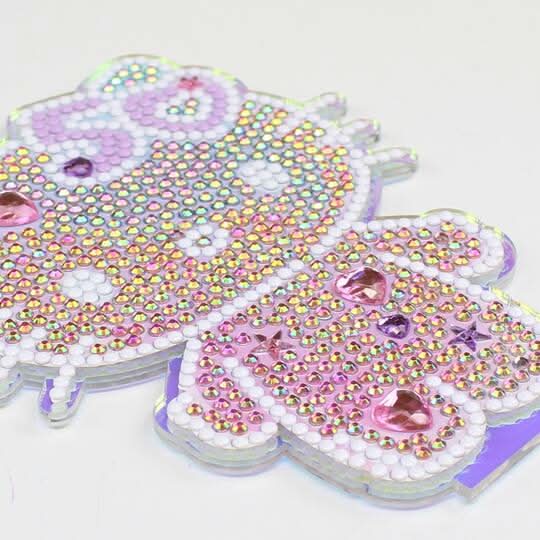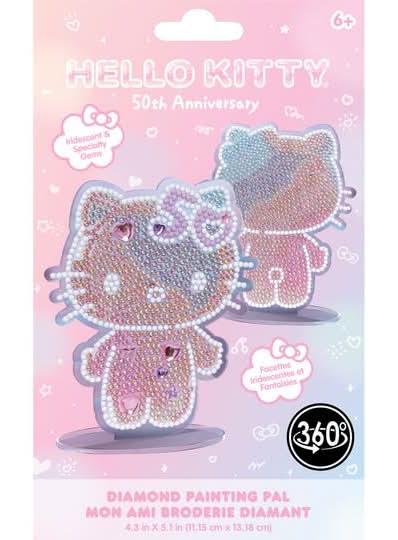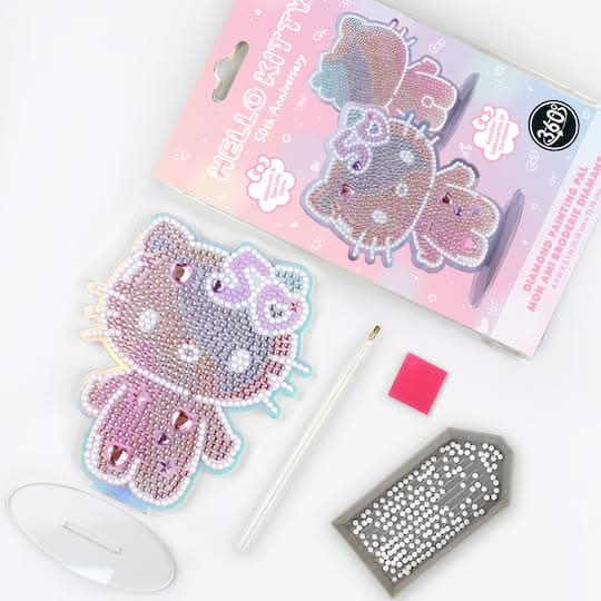 This Hello Kitty 40th Anniversary kit features two adhesive surfaces, giving you a full 360 degrees to diamond paint your favorite character! Hello Kitty design .For ages 6 and up . Collectible acrylic figurine with base Sorted acrylic gems . Sorted acrylic gems Stylus . Stylus Tray .