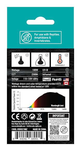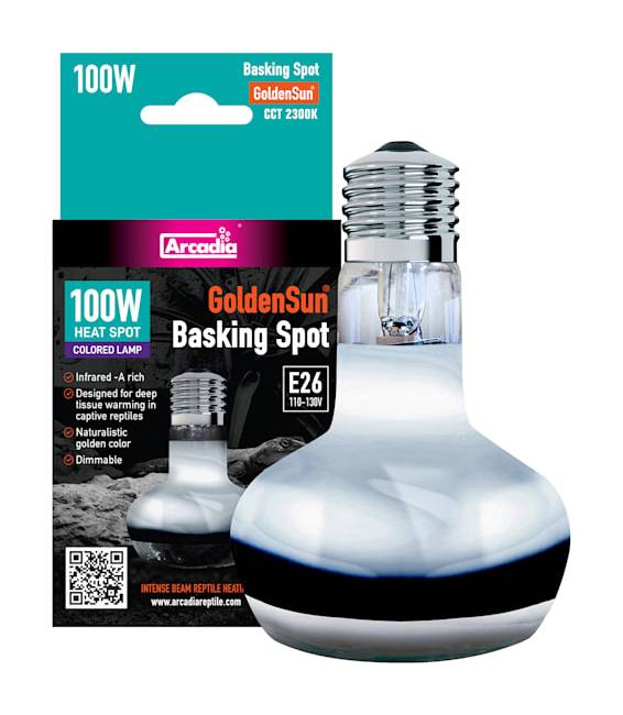 The Arcadia Reptile GoldenSun Colored Basking Spot is expertly designed to emmit a highly bioavailable, intense-beam, naturalistic golden glow for deep tissue warming within your reptiles. Available in 50, 75, 100 and 150W. CCT 2300 Kelvin Arcadia GoldenSun Spot Lamps have a tight focused beam that will allow for intense heat provision on a concentrated basking spot. Experty designed to increase ambient temperatures with a focused beam for intense basking. This is essential for desert basking species and for those species in taller enclosures. The lamp has an inviting warm color and uses standard E26 fittings. Use with a thermostat and alongside a species appropriate Arcadia Reptile UVB and LED System.