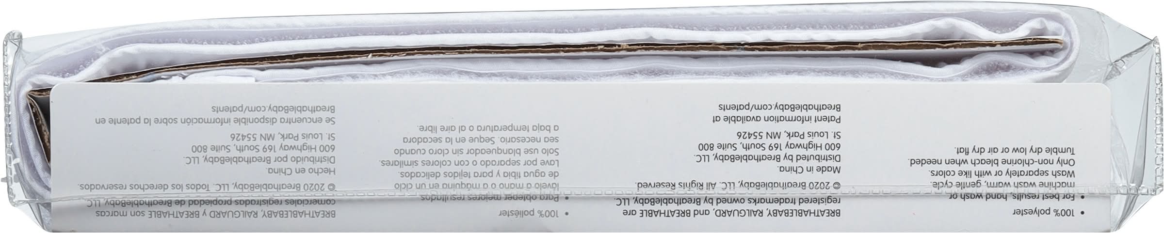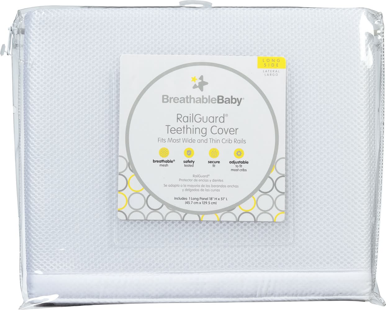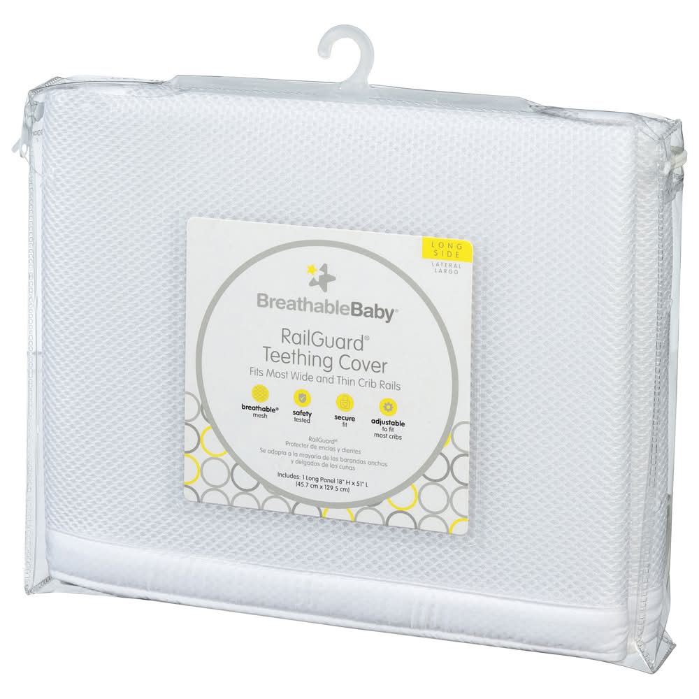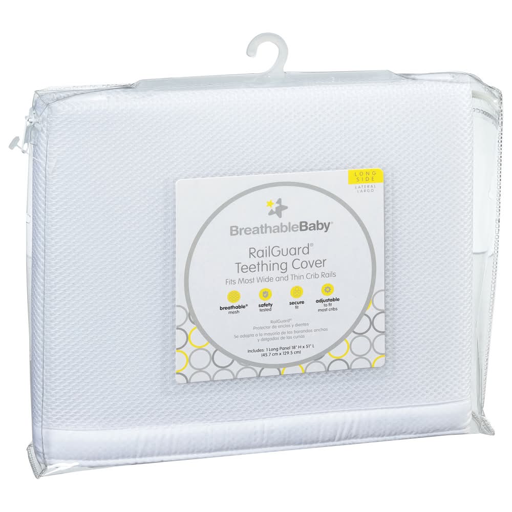 Includes: 2 long panel 18 inch H x 51 inch L (45.7 cm x 129.5 cm). Long side. Fits most wide and thin crib rails. Breathable mesh. Safety tested. Secure fit. Adjustable to fit mast cribs. We took great care to develop the RailGuard Teething Cover, to help protect babies from cracks, splinters, and peeling. while also saving crib rails, giving moms and dads that extra peace of mind. Our one-size-fits-most design installs easily with hook and loop closure, and adjustable straps to create a secure fit. Extra handy front pocket keeps baby's pacifier nearby, to help create more of the magical (and sometimes rare) quiet moments and that's what makes it all worth it! Fits most wide and thin crib rails. Helps protect teething babies from cracks, splinters and peeling. Rail cover fastens securely to crib rail and slats. Contains no harmful chemicals, flame retardants or formaldehyde. One long panel 18 inches H x 51 inches L (45.7 cm x 129.5 cm). Use with coordinating short panels (sold separately) for more coverage. Easy to Attach: Squeeze fasteners together along edges between slats, attach ties to outside of crib for a secure fit BreathableBaby.com. BreathableBaby for safe sleep. Every purchase helps support. Safe sleep research & education. Together we help give back the gift of sound sleep and peace of mind! We take a portion of proceeds from every product to help support safe sleep research and educational programs. Made in China. BreathableBaby, LLC,