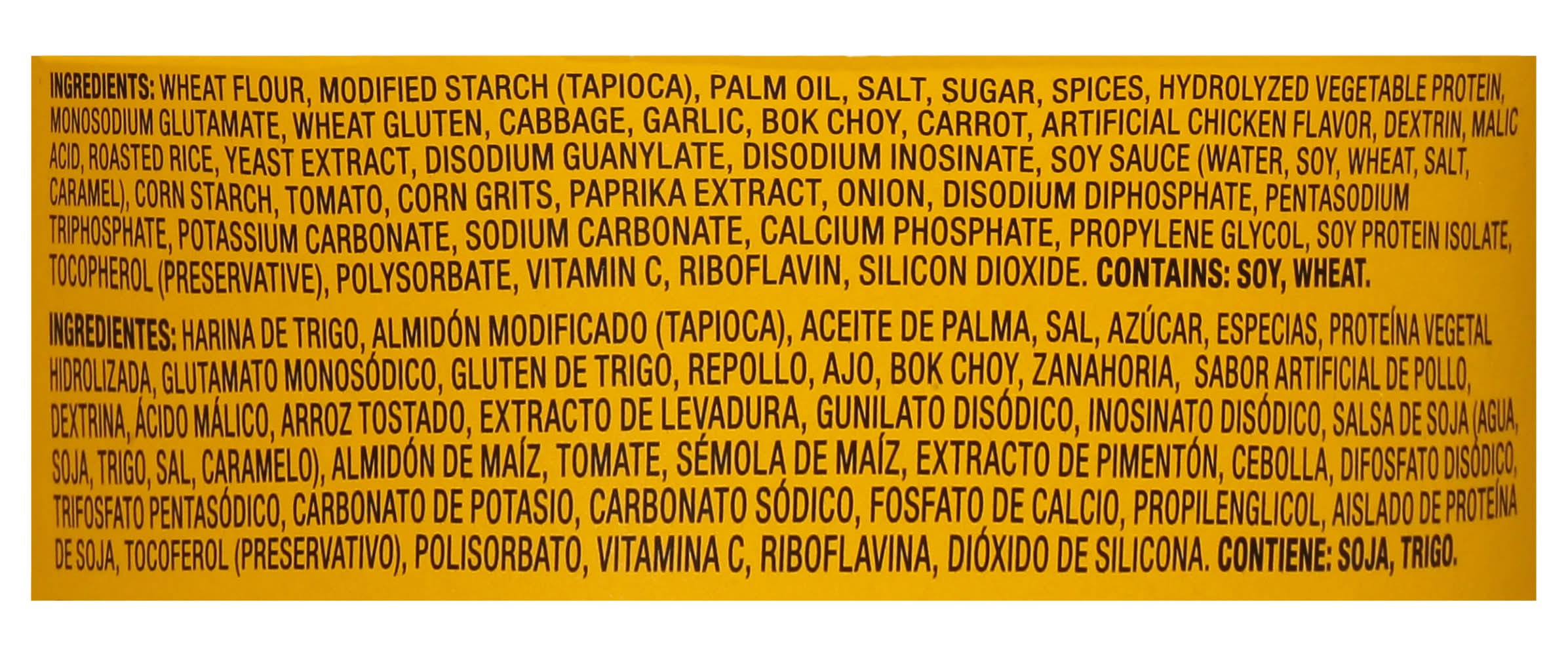 Ingredients: Wheat Flour, Modified Starch (Tapioca), Palm Oil, Salt, Sugar, Spices, Hydrolyzed Vegetable Protein, Monosodium Glutamate, Wheat Gluten, Cabbage, Garlic, Bok Choy, Carrot, Artificial Chicken Flavor, Dextrin, Malic Acid, Roasted Rice, Yeast Extract, Disodium Guanylate, Disodium Inosinate, Soy Sauce (Water, Soy, Wheat, Salt, Caramel), Corn Starch, Tomato, Corn Grits, Paprika Extract, Onion, Disodium Diphosphate, Pentasodium Triphosphate, Potassium Carbonate, Sodium Carbonate, Calcium Phosphate, Propylene Glycol, Soy Protein Isolate, Tocopherol (Preservative), Polysorbate, Vitamin C, Riboflavin, Silicon Dioxide Contains: Soybeans, Wheat, Gluten
