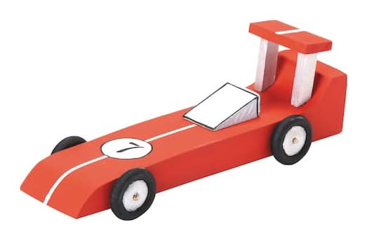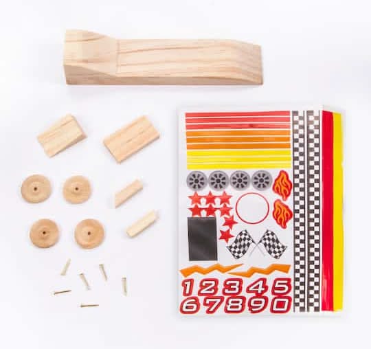 Complete your child's toy car collection with this wooden race car model kit. 6.25" x 2.125" (15.88cm x 5.4cm) car size. 1 race car kits. Includes decals for decorating . Assembly required. For ages 8 and up