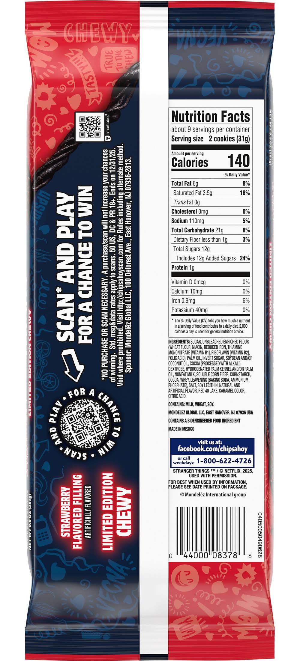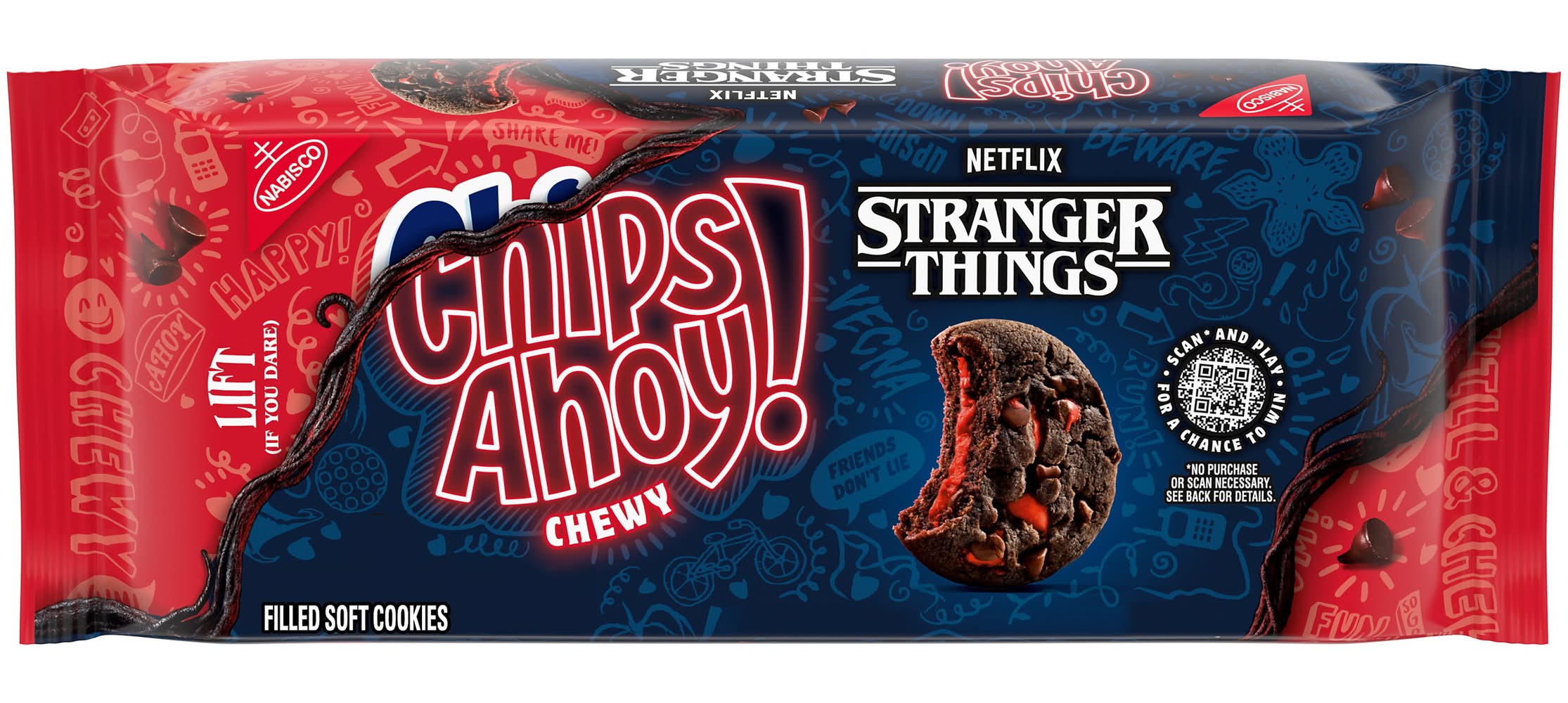 Experience a cookie straight from the Upside Down with CHIPS AHOY! Stranger Things Chewy Chocolatey Strawberry-Flavored Filled Soft Cookies. Baked for maximum chewiness, these sweet snacks pair chocolatey, chewy cookies with red, strawberry-flavored filling for a taste that's an 11 out of 10. Like the delicious flavors, the "Upside Down" package design is inspired by Netflix's Stranger Things and features Easter eggs that will delight fans just as much as the limited edition CHIPS AHOY! cookies. These soft cookies make wonderful watch party snacks, birthday treats, and fun snacks for game night. Add these sweet treats to lunchboxes and tote bags for work snacks and after-lunch snacks, or pair these chewy cookies with your favorite ice cream flavor for an extra-special treat. The resealable package with easy-pull tab helps keep these certified kosher cookies fresh, making them great shareable office snacks and travel snacks. Lift the tab—if you dare—to taste these monstrously tasty treats! Scan the pack’s QR code to virtually enter the Upside Down, play an exclusive game, and enter for a chance to win exclusive rewards, bringing happiness back to the world.