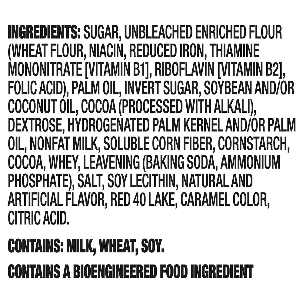 Ingredients: INGREDIENTS: SUGAR, UNBLEACHED ENRICHED FLOUR (WHEAT FLOUR, NIACIN, REDUCED IRON, THIAMINE MONONITRATE [VITAMIN B1], RIBOFLAVIN [VITAMIN B2], FOLIC ACID), PALM OIL, INVERT SUGAR, SOYBEAN AND, OR COCONUT OIL, COCOA (PROCESSED WITH ALKALI), DEXTROSE, HYDROGENATED PALM KERNEL AND, OR PALM OIL, NONFAT MILK, SOLUBLE CORN FIBER, CORNSTARCH, COCOA, WHEY, LEAVENING (BAKING SODA, AMMONIUM PHOSPHATE), SALT, SOY LECITHIN, NATURAL AND ARTIFICIAL FLAVOR, RED 40 LAKE, CARAMEL COLOR, CITRIC ACID. CONTAINS: MILK, WHEAT, SOY. Contains: CONTAINS: MILK, WHEAT, SOY.