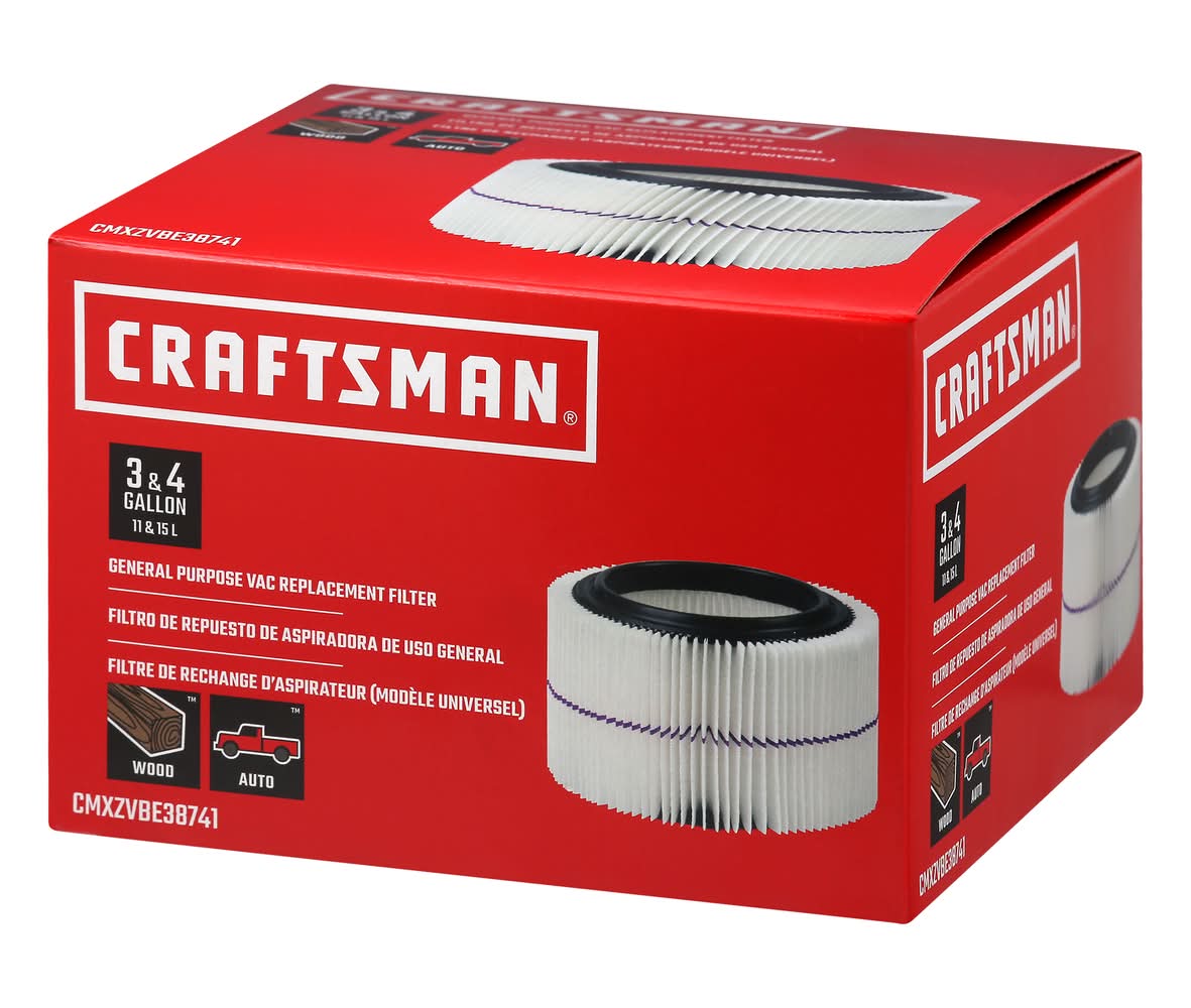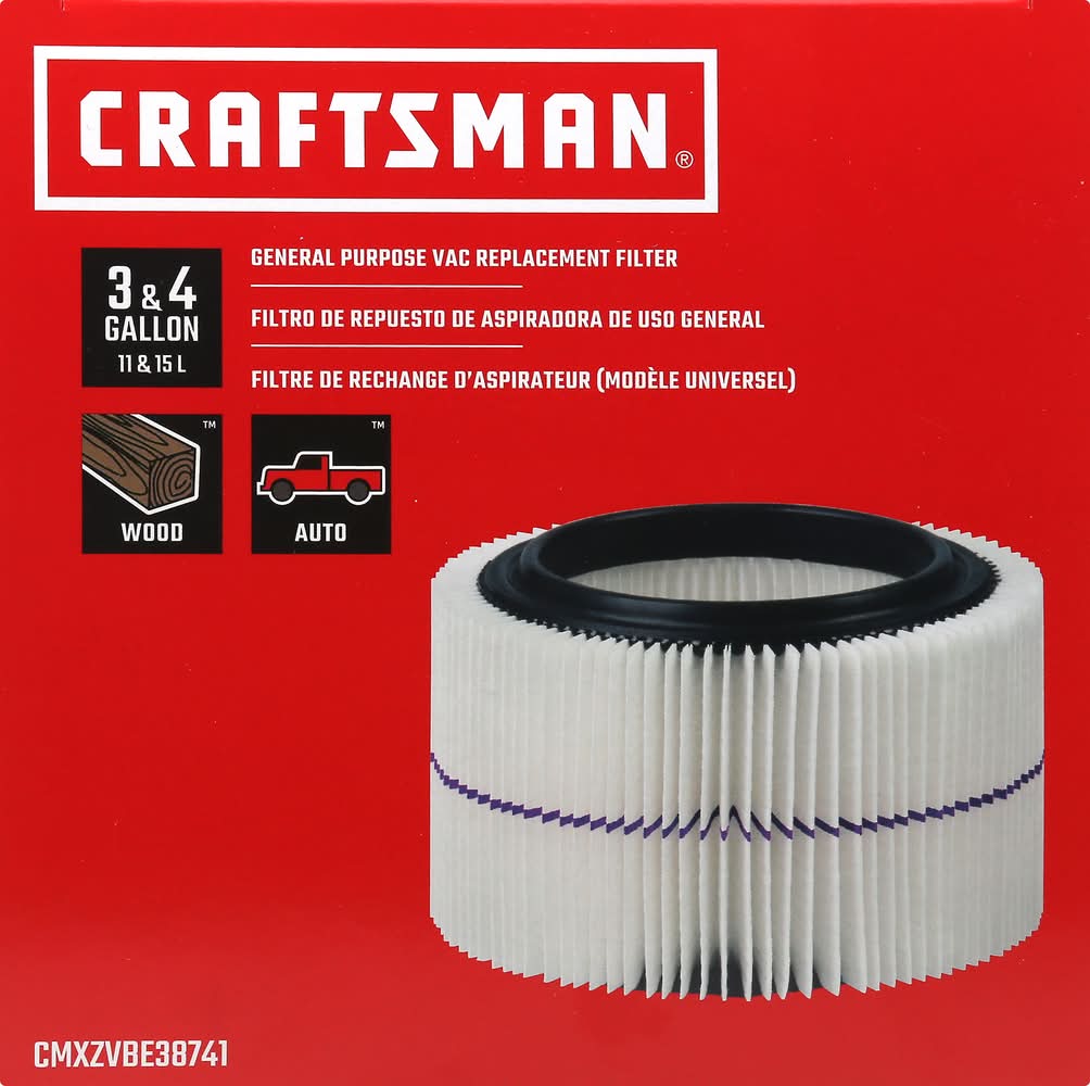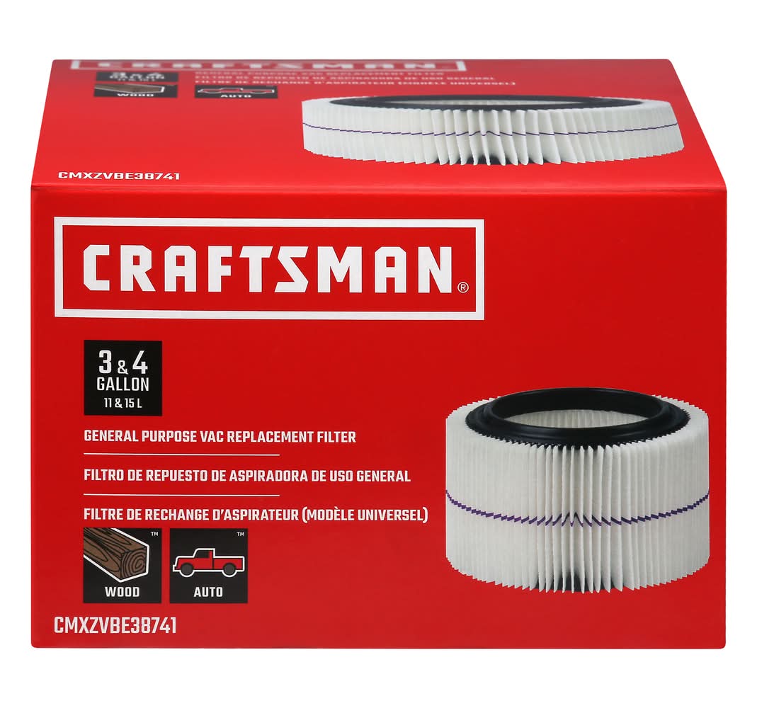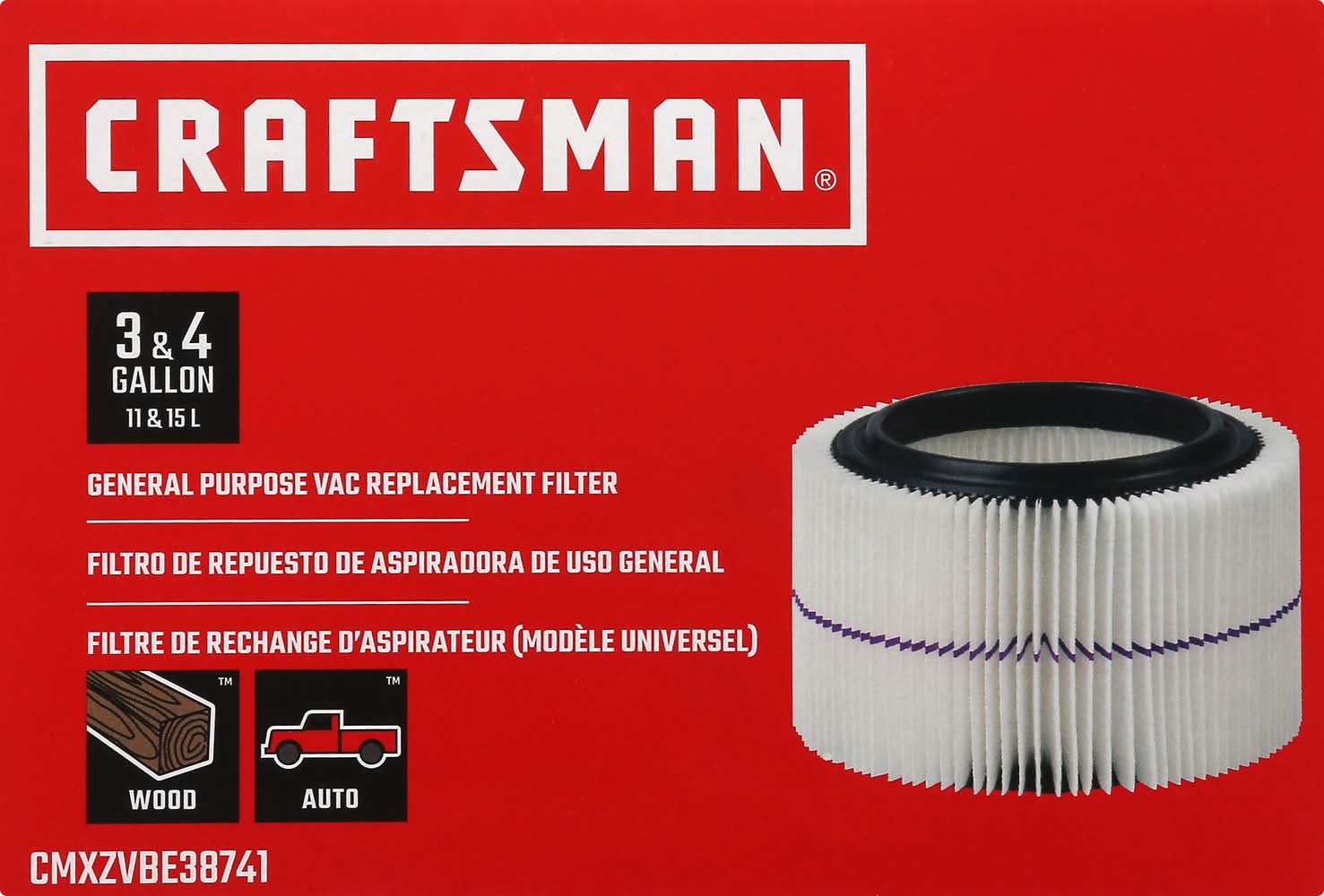 3 & 4 gallon (11 & 15 l). Wood; auto. For Use with Debris Such as: car/truck dirt, sawdust, jobsite debris. Specifications: Fits, 3 & 4 gal. vacs. Includes: (1) General purpose Vac Replacement Filter. US & Canada only. www.craftsman.com. For product, service or warranty information contact us at: craftsman.com. 888-331-4569. The model no. of your vac is located on the motor housing. For a full list of compatible models see www.craftsman.com or scan. Made in Mexico. Emerson Tool Company,